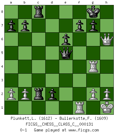 Last move : 0-1 2010 March 4 12:42:21 [Event "FICGS__CHESS__CLASS_C__000131"] [Site "FICGS"] [Date "2009.12.17"] [Round "1"] [White "Plunkett,Louis"] [Black "Bullerkotte,Frank"] [Result "0-1"] [WhiteElo "1612"] [BlackElo "1609"] 1.f4 d5 2.Nf3 Nf6 3.d4 Bf5 4.Nbd2 Nbd7 5.e3 e6 6.Be2 Be7 7.Ne5 c5 8.O-O cxd4 9.exd4 h6 10.Bd3 Bxd3 11.cxd3 O-O 12.Ndf3 Qb6 13.Kh1 Rfc8 14.Qe2 Rc7 15.Nxd7 Nxd7 16.Be3 Rac8 17.Ne5 Nxe5 18.fxe5 Rc2 19.Qg4 Bg5 20.Bxg5 hxg5 21.Qxg5 Qxd4 22.Qe7 R2c7 23.Qg5 Qxd3 24.Rf3 Qg6 25.Qe3 Rc2 26.Rg3 d4 27.Qf4 Qf5 28.Qh6 Qxe5 29.Rg4 d3 30.Rf1 d2 0-1 Bird's Opening Kingside Castling by player White (move 8) Kingside Castling by player Black (move 11) Player Black won this chess game. Follow this game move after move (download)No Chess Grandmaster is normal; they only differ in the extent of their madness. (Viktor Korchnoi) Bis zum Jahr 1971 verlief in meiner Schachkariere alles glatt. Dieses dramatische Match [Fischer-Taimanov 6:0] machte mein Leben zur Hölle. (Mark Taimanov) Observen a Garry Kasparov. Después de una derrota, invariablemente el gana la próxima partida. Prácticamente hace pedazos a su siguiente oponente. Eso es algo que tenemos que aprender a lograr. (Maurice Ashley) On croit qu'il y a plus de mauvais joueurs que de bons joueurs, c'est faux : Il y a autant de joueurs qui gagnent que de joueurs qui perdent. (Philippe Geluck) The good fighters of old first put themselves beyond the possibility of defeat, and then waited for an opportunity of defeating the enemy. (Sun Tzu)