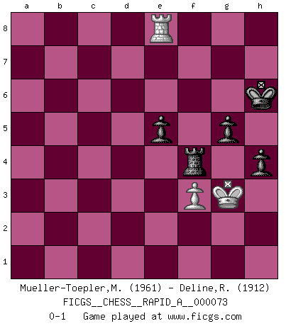 Last move : 0-1 2010 March 7 9:29:9 [Event "FICGS__CHESS__RAPID_A__000073"] [Site "FICGS"] [Date "2009.12.17"] [Round "1"] [White "Mueller-Toepler,Michael"] [Black "Deline,Ralph"] [Result "0-1"] [WhiteElo "1961"] [BlackElo "1912"] 1.e4 c5 2.h3 Nc6 3.Nf3 d6 4.Nc3 Nf6 5.d4 cxd4 6.Nxd4 e5 7.Nde2 Be6 8.f4 Qa5 9.Bd2 Qb6 10.Na4 Qc7 11.Nec3 Be7 12.Bd3 a6 13.f5 Bd7 14.O-O b5 15.Nd5 Nxd5 16.exd5 bxa4 17.dxc6 Bxc6 18.Be3 Bf6 19.c4 O-O 20.Rb1 Rab8 21.Qc2 Rfe8 22.Be4 Rb4 23.b3 Bxe4 24.Qxe4 axb3 25.axb3 Reb8 26.Qd3 h6 27.Rfe1 Qb7 28.Qxd6 Rd8 29.Qc5 Rxb3 30.Rxb3 Qxb3 31.Qc6 Bh4 32.Bf2 Bxf2+ 33.Kxf2 Qc3 34.Qxa6 Rd2+ 35.Kf1 Kh7 36.Qb7 Qxc4+ 37.Kg1 Qd4+ 38.Kh1 Qf2 39.Qe4 f6 40.Ra1 Rd4 41.Qf3 Qxf3 42.gxf3 Rf4 43.Kg2 Rxf5 44.Ra7 Rf4 45.Kg3 h5 46.h4 Kh6 47.Ra8 g5 48.hxg5+ fxg5 49.Re8 h4+ 0-1 Sicilian defense Kingside Castling by player White (move 14) Kingside Castling by player Black (move 19) 10 pieces endgame at move 43 : White KRPP , Black KRPPPP WHITE : King + 1 Rook 2 Pawns BLACK : King + 1 Rook 4 Pawns 9 pieces endgame at move 48 : White KRPP , Black KRPPP WHITE : King + 1 Rook 2 Pawns BLACK : King + 1 Rook 3 Pawns 8 pieces endgame at move 48 : White KRP , Black KRPPP WHITE : King + 1 Rook 1 Pawn BLACK : King + 1 Rook 3 Pawns Player Black won this chess game. Follow this game move after move (download)The tactician must know what to do whenever something needs doing; the strategist must know what to do when nothing needs doing. (Savielly Tartakover) Dein Körper muss in Topform sein. Dein Schach verfällt, wenn dein Körper verfällt. Der Körper kann nicht vom Geist getrennt werden. (Robert James Fischer) Un juego de Ajedrez es un dialogo, una conversación entre un jugador y su oponente. Cada movimiento del oponente puede contener amenazas o tropiezos, pero un jugador no se puede defender de las amenazas o tomar ventaja de los tropiezos si es que no se pregunta a sí mismo: ¿Que es lo que mi oponente va a hacer después de cada movida?. (Bruce A. Moon) Les Echecs mettent en conflit, non pas deux intelligences, mais deux volontés. (Lasker) Vladimir Ras-Putin is still alive... He is also a good actor, I saw him in the Lord of the Rings. (Rodolfo d'Ettorre)