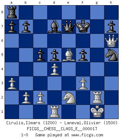 Last move : 1-0 2007 April 23 13:51:45 [Event "FICGS__CHESS__CLASS_E__000017"] [Site "FICGS"] [Date "2006.10.07"] [Round "1"] [White "Cirulis,Ilmars"] [Black "Laneval,Olivier"] [Result "1-0"] [WhiteElo "1200"] [BlackElo "1500"] 1.d4 d5 2.Nf3 f5 3.Bf4 Nf6 4.Nc3 c6 5.e3 e6 6.Bd3 Be7 7.O-O O-O 8.h4 Ng4 9.a3 Nd7 10.Ng5 Ndf6 11.f3 Nh6 12.Qe2 Nh5 13.Bh2 Bxg5 14.hxg5 Qxg5 15.Qd2 f4 16.exf4 Rxf4 17.Rad1 Qf6 18.Ne2 Rh4 19.Be5 Qe7 20.g3 Bd7 21.gxh4 Qxh4 22.Rf2 Qe7 23.Bxg7 Nf5 24.Be5 c5 25.Bxf5 exf5 26.Rg2+ Kf7 27.Qh6 1-0 Queen's pawn game Kingside Castling by player White (move 7) Kingside Castling by player Black (move 7) Player White won this chess game. Follow this game move after move (download)Suddenly it was obvious to me in my analysis I had missed what Fischer had found with the greatest of ease at the board. (Mikhail Botvinnik) Es hat in meinem Leben Zeiten gegeben, in denen das Schachspiel, wenn nicht zum Lebenszweck, so doch zu einem regelrechten Lebensersatz geworden ist. Man fühlt sich in solchen Zeiten nicht so, als besäße man eine göttliche Gabe, sondern eher so, als sei man von ihr besessen. (Garry Kasparov) Las piezas de Ajedrez son los bloques del alfabeto que moldean los pensamientos; y esos pensamientos, aunque hagan un diseño visual en el tablero, expresan abstractamente su belleza como un poema. (Marcel Duchamp) Le profane ne songe pas à la somme de jouissance dont il se prive, qui méconnaît ce jeu aux ressources aussi variées que passionnantes. (Jean-Marie Jeanton-Lamarche) The best weapon against an enemy is another enemy. (Friedrich Nietzsche)