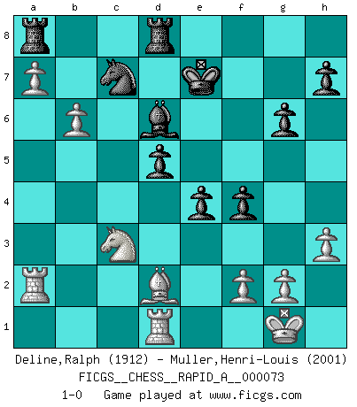 Last move : 1-0 2010 January 23 15:45:11 [Event "FICGS__CHESS__RAPID_A__000073"] [Site "FICGS"] [Date "2009.12.17"] [Round "1"] [White "Deline,Ralph"] [Black "Muller,Henri-Louis"] [Result "1-0"] [WhiteElo "1912"] [BlackElo "2001"] 1.e4 c5 2.Nf3 d6 3.d4 cxd4 4.Nxd4 Nf6 5.Nc3 a6 6.Be2 e5 7.Nb3 Be7 8.Qd3 Nc6 9.Nd5 O-O 10.O-O Be6 11.Rd1 Re8 12.c3 Rc8 13.Be3 Bxd5 14.exd5 Nb8 15.h3 Nbd7 16.c4 Qc7 17.Rac1 Bf8 18.Nd2 Nc5 19.Qc2 Ncd7 20.Nb1 Nb6 21.Qb3 Nfd7 22.Nd2 Nc5 23.Qa3 a5 24.Qxa5 Nxd5 25.Qxc7 Nxc7 26.b4 N5e6 27.Bf3 Rb8 28.Ne4 Red8 29.Nc3 f5 30.a4 Rd7 31.a5 g6 32.b5 e4 33.Be2 Kf7 34.c5 R7d8 35.b6 Ne8 36.c6 bxc6 37.Na4 f4 38.Bd2 d5 39.Bg4 Be7 40.a6 Ra8 41.Bxe6+ Kxe6 42.a7 Bd6 43.Rxc6 Kd7 44.Rc2 Ke7 45.Nc3 Nc7 46.Ra2 1-0 Sicilian : Najdorf, Opovcensky variation Kingside Castling by player Black (move 9) Kingside Castling by player White (move 10) Player White won this chess game. Follow this game move after move (download)If cunning alone were needed to excel, women would be the best Chess players. (Albin) Wenn es im Universum noch irgendwo intelligente Lebewesen gibt, dann kennen sie Go. (Emanuel Lasker) Las leyes del Ajedrez no permiten una libre elección: tienes que mover quieras o no. (Emanuel Lasker) Une platitude souvent récitée à propos des Echecs est qu'une des choses les plus difficiles à réaliser est de gagner une position gagnante. Cela ne manque pas de sens mais, pour ma part, j'ai toujours trouvé plus difficile de gagner une position perdante. (Tim Krabbe) Heh, heh, heh. Time to abandon ship. (General Grievous in Star Wars ep.3)