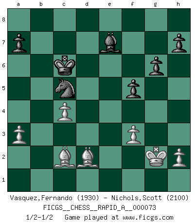 Last move : 1/2-1/2 2010 March 5 3:15:18 [Event "FICGS__CHESS__RAPID_A__000073"] [Site "FICGS"] [Date "2009.12.17"] [Round "1"] [White "Vasquez,Fernando"] [Black "Nichols,Scott"] [Result "1/2-1/2"] [WhiteElo "1930"] [BlackElo "2100"] 1.e4 b6 2.Nf3 Bb7 3.Nc3 e6 4.d4 Bb4 5.Bd3 Nf6 6.Qe2 d5 7.exd5 Nxd5 8.Bd2 Nxc3 9.bxc3 Be7 10.Qe5 O-O 11.Qh5 g6 12.Qh6 Bxf3 13.gxf3 Bh4 14.Be4 c6 15.Rg1 Qe7 16.f4 Bf6 17.Kf1 Bg7 18.Qg5 Qd6 19.f5 exf5 20.Bxf5 Nd7 21.Qf4 Qxf4 22.Bxf4 Nf6 23.Bg5 c5 24.dxc5 bxc5 25.Bd3 Rab8 26.Re1 Rb2 27.a3 c4 28.Bxc4 Rxc2 29.Rg3 Rc8 30.Bb3 Rb2 31.c4 Nd7 32.Bc1 Rb1 33.Bd2 Rxe1+ 34.Bxe1 Nc5 35.Ba2 Rb8 36.Bb4 Bf8 37.Rg5 f5 38.Rg2 Kf7 39.f3 Rd8 40.Rc2 Rd4 41.Kg2 Ke6 42.Bb1 Kd7 43.Rd2 Rxd2+ 44.Bxd2 Kc6 45.Bc2 Be7 1/2-1/2 Owen defense Kingside Castling by player Black (move 10) This chess game ended in a draw. Follow this game move after move (download)A man without frontiers. He didn't divide the East and the West, he brought them together in their admiration for him. (Ljubomir Ljubojevic, about Bobby Fischer's death) Privat ist Kortschnoi kein schlechter Mensch, sehr sympathisch. Aber während des Spiels ist er grausam. Er will dich töten. (Miguel Najdorf) Una compensación adecuada por un sacrificio es tener una combinación sólida que conduce a una posición ganadora; una compensación adecuada por una metida de pata es dejar a tu oponente arrebatar una derrota de las fauces de la victoria. (Bruce A. Moon) Les échecs, c'est la lutte contre l'erreur. (Johannes Zukertort) Life is like a game of cards: the hand you are dealt represents determinism; the way you play it is free will. (Jawaharlal Nehru)
