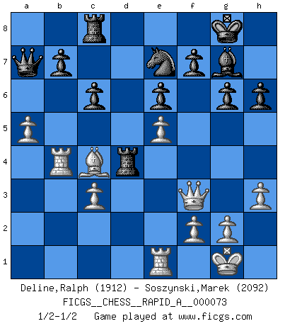 Last move : 1/2-1/2 2009 December 29 21:29:0 [Event "FICGS__CHESS__RAPID_A__000073"] [Site "FICGS"] [Date "2009.12.17"] [Round "1"] [White "Deline,Ralph"] [Black "Soszynski,Marek"] [Result "1/2-1/2"] [WhiteElo "1912"] [BlackElo "2092"] 1.e4 d5 2.exd5 Qxd5 3.Nc3 Qd6 4.Nf3 Nf6 5.d4 g6 6.Nb5 Qb6 7.Bd3 Bg7 8.O-O c6 9.Na3 O-O 10.Qe2 Bg4 11.c3 Nd5 12.h3 Bxf3 13.Qxf3 Nd7 14.Bc4 e6 15.Nc2 a5 16.a4 Rac8 17.Re1 Rfd8 18.Rb1 h6 19.Bd2 Ne7 20.b4 axb4 21.Rxb4 Qa7 22.a5 Ne5 23.dxe5 Rxd2 24.Nd4 Rxd4 1/2-1/2 Scandinavian : Pytel-Wade variation Kingside Castling by player White (move 8) Kingside Castling by player Black (move 9) This chess game ended in a draw. Follow this game move after move (download)You need not play well - just help your opponent to play badly. (Genrikh Chepukaitis) Ich verstehe den Grund nicht, warum die Aufteilung in Frauen und Männer überhaupt im Schach besteht. (Judith Polgar) No existe un remordimiento como el remordimiento del Ajedrez. (H. G. Wells) Le génie consiste à savoir transgresser les règles au moment opportun. (Teichmann) A good player is always lucky. (Capablanca)