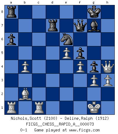 Last move : 0-1 2010 January 1 13:50:56 [Event "FICGS__CHESS__RAPID_A__000073"] [Site "FICGS"] [Date "2009.12.17"] [Round "1"] [White "Nichols,Scott"] [Black "Deline,Ralph"] [Result "0-1"] [WhiteElo "2100"] [BlackElo "1912"] 1.c4 Nf6 2.g3 c6 3.Bg2 d5 4.d4 dxc4 5.Nf3 Nbd7 6.Qc2 Nb6 7.O-O g6 8.e4 Bg7 9.b3 cxb3 10.axb3 O-O 11.Nc3 Ne8 12.Be3 f5 13.e5 Nc7 14.Ng5 h6 15.Nh3 g5 16.f4 g4 17.Nf2 Be6 18.Nd3 Nbd5 19.Bd2 Nxc3 20.Bxc3 Bd5 21.Bb2 Bxg2 22.Kxg2 Qd5+ 23.Kg1 e6 24.Rfc1 Rfb8 25.Nc5 Bf8 26.b4 Be7 27.Ra5 Nb5 28.Nxe6 Qxe6 29.d5 Qf7 30.dxc6 a6 31.cxb7 Rxb7 32.Qc6 Rba7 33.Qxh6 Bf8 34.Qg5+ Bg7 35.R5a1 Nc7 36.Qh4 Ne6 37.h3 Rd7 0-1 English, 1...Nf6 (Anglo-Indian defense) Kingside Castling by player White (move 7) Kingside Castling by player Black (move 10) Player Black won this chess game. Follow this game move after move (download)Your body has to be in top condition. Your Chess deteriorates as your body does. You can't separate body from mind. (Bobby Fischer) Konzentriere dich auf materielle Gewinne. Nimm, was dir dein Gegner gibt, ausser es gibt einen guten Grund der dagegenspricht. (Robert James Fischer) Existen dos clases de sacrificios: los correctos y los míos. (Mikhail Tal) On n'a jamais que l'âge auquel on a commence à jouer aux échecs car après on cesse de vieillir. (Capablanca) The Internet isn't free. It just has an economy that makes no sense to capitalism. (Brad Shapcott)