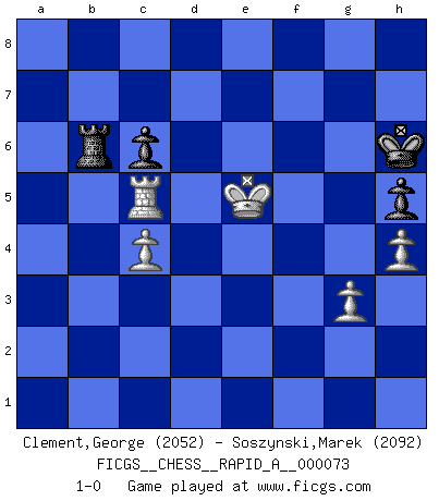 Last move : 1-0 2010 January 29 17:0:1 [Event "FICGS__CHESS__RAPID_A__000073"] [Site "FICGS"] [Date "2009.12.17"] [Round "1"] [White "Clement,George"] [Black "Soszynski,Marek"] [Result "1-0"] [WhiteElo "2052"] [BlackElo "2092"] 1.e4 d5 2.exd5 Qxd5 3.Nc3 Qd6 4.d4 g6 5.Nf3 Nf6 6.Nb5 Qb6 7.c4 c6 8.Nc3 Bg7 9.Be2 O-O 10.O-O Na6 11.a3 Bf5 12.h3 Rad8 13.c5 Qc7 14.Qa4 Nb8 15.Qxa7 Nbd7 16.Qa4 Ne4 17.Re1 Nxc3 18.bxc3 Ra8 19.Qb3 Be6 20.Bc4 Bxc4 21.Qxc4 b5 22.Qb3 e5 23.Ra2 Ra4 24.Rae2 Rfa8 25.h4 h5 26.Bb2 Rf8 27.Qc2 Rd8 28.Qc1 Re8 29.Ng5 Rf8 30.g3 Bh6 31.dxe5 Nxc5 32.e6 Rc4 33.exf7+ Qxf7 34.Nxf7 Bxc1 35.Ne5 Bxb2 36.Nxc4 bxc4 37.Rxb2 Nd3 38.R1e2 Nxb2 39.Rxb2 Ra8 40.Rb4 Rxa3 41.Rxc4 Ra6 42.Rc5 Kf7 43.f4 Kf6 44.Kf2 Ke6 45.Ke3 Ke7 46.Ke4 Ke6 47.c4 Kf6 48.f5 gxf5+ 49.Rxf5+ Kg6 50.Rg5+ Kh6 51.Rc5 Rb6 52.Ke5 1-0 Scandinavian : Pytel-Wade variation Kingside Castling by player Black (move 9) Kingside Castling by player White (move 10) 10 pieces endgame at move 48 : White KRPPP , Black KRPPP WHITE : King + 1 Rook 3 Pawns BLACK : King + 1 Rook 3 Pawns 9 pieces endgame at move 49 : White KRPPP , Black KRPP WHITE : King + 1 Rook 3 Pawns BLACK : King + 1 Rook 2 Pawns Player White won this chess game. Follow this game move after move (download)Who is your opponent tonight, tonight I am playing against the Black pieces. (Akiba Rubinstein) Ich habe Putins Aufstieg an die Macht beobachtet und seine Politik, die demokratischen Institutionen meines Landes zu zerstören. (Garry Kasparov) Mi estilo es algo parecido entre un poco de Tal y Petrosian. (Reshevsky) Le jeu d'échecs fait naître et fortifie en nous plusieurs qualités précieuses dans le cours de l'existence, telles que la prévoyance, la circonspection, la prudence, et la persévérance. (Benjamin Franklin - 1783, la morale des échecs) Perhaps chess is the wrong game for the times (The Chess Master and the Computer, by Garry Kasparov - 2010)