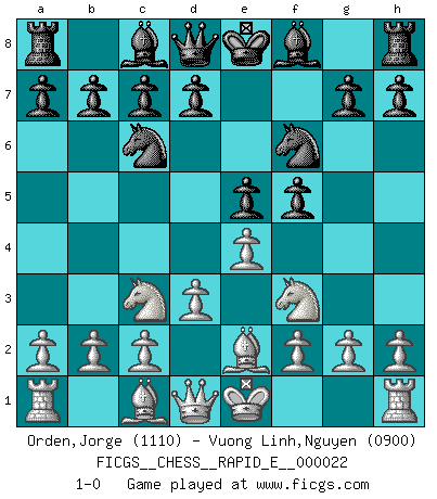 Last move : 1-0 2010 January 25 8:23:41 [Event "FICGS__CHESS__RAPID_E__000022"] [Site "FICGS"] [Date "2009.12.18"] [Round "1"] [White "Orden,Jorge"] [Black "Vuong Linh,Nguyen"] [Result "1-0"] [WhiteElo "1110"] [BlackElo "0900"] 1.e4 e5 2.Nf3 Nc6 3.Nc3 f5 4.d3 Nf6 5.Be2 1-0 This chess game has been lost on time (started : 2009.12.18 5:17:19) Three knights : Winawer defense (Gothic defense) Player White won this chess game. Follow this game move after move (download)Chess holds its master in its own bonds, shackling the mind and brain so that the inner freedom of the very strongest must suffer. (Albert Einstein) Der vorletzte Fehler gewinnt. (Savielly Grigorievitsch Tartakower) No soy una persona materialista y por eso, no resiento la falta o pérdida del dinero. La ausencia de cosas mundanas carece de importancia. Ya que el Ajedrez es una forma en la que puedo ser tan materialista como yo desee sin tener la necesidad de vender mi alma. (Jamie Walter Adams) Le joueur d'Echecs qui veut atteindre le top est obligé de développer son propre credo créatif. Alexeï Stepanovicth Souétine. Il est facile d'écrire des livres ! Ce qui est difficile, c'est de jouer ! (Alexeï Stepanovicth Souétine) The meaning of life is that it is to be lived, and it is not to be traded and conceptualized and squeezed into a pattern of systems. (Bruce Lee)