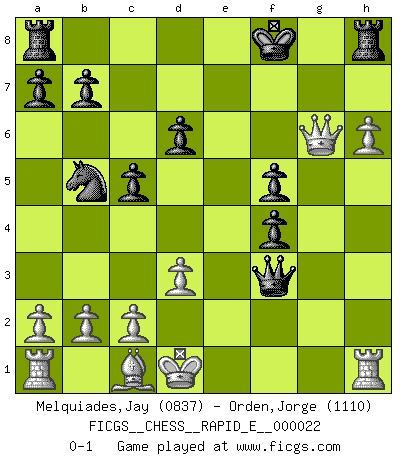 Last move : 0-1 2010 February 11 4:48:55 [Event "FICGS__CHESS__RAPID_E__000022"] [Site "FICGS"] [Date "2009.12.18"] [Round "1"] [White "Melquiades,Jay"] [Black "Orden,Jorge"] [Result "0-1"] [WhiteElo "0837"] [BlackElo "1110"] 1.e4 c5 2.Nf3 d6 3.Nc3 Nf6 4.d3 e6 5.h4 Be7 6.e5 Ng4 7.Ng5 f5 8.g3 Nxe5 9.f4 Ng4 10.Bh3 h6 11.Bxg4 hxg5 12.Bh5+ Kf8 13.hxg5 g6 14.g4 gxh5 15.gxh5 e5 16.Nd5 Nc6 17.h6 Be6 18.Nxe7 Qxe7 19.Qh5 Bf7 20.g6 Bxg6 21.Qxg6 Nd4 22.Kd2 exf4 23.Kc3 Nb5+ 24.Kd2 Qe3+ 25.Kd1 Qf3+ 0-1 Sicilian Player Black won this chess game. Follow this game move after move (download)We must make sure that Chess will not be like a dead language, very interesting, but for a very small group. (Sytze Faber) Ivan Sokolov treibt mich als Beifahrer an mit go Loeky go - . (Loek van Wely) El muchacho (en ese entonces un niño de 12 años llamado Anatoly Karpov) no tiene ni idea de lo que es el Ajedrez y no hay futuro en absoluto para el en esta profesión. (Mikhail Botvinnik) Plusieurs personnes se sont demandées comment Tal faisait pour gagner... En fait, c'est très simple ! Il met ses pièces au centre de l'échiquier et les sacrifie quelque part ! (David Bronstein) Optimism is a variety of information deficit. Sometimes especially true for correspondence chess games. (Michael Aigner)