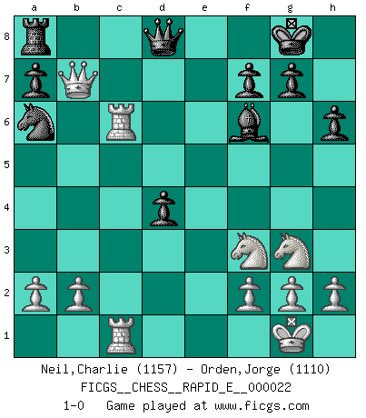 Last move : 1-0 2010 February 20 14:27:14 [Event "FICGS__CHESS__RAPID_E__000022"] [Site "FICGS"] [Date "2009.12.18"] [Round "1"] [White "Neil,Charlie"] [Black "Orden,Jorge"] [Result "1-0"] [WhiteElo "1157"] [BlackElo "1110"] 1.d4 d5 2.c4 e6 3.Nf3 Nf6 4.Bg5 Be7 5.e3 h6 6.Bxf6 Bxf6 7.Nc3 O-O 8.cxd5 exd5 9.Bd3 b6 10.O-O Bb7 11.Rc1 c5 12.dxc5 bxc5 13.e4 d4 14.Ne2 Re8 15.Qb3 Bxe4 16.Bxe4 Rxe4 17.Ng3 Re7 18.Rxc5 Rc7 19.Rfc1 Na6 20.Rc6 Rb7 21.Qxb7 1-0 QGD Kingside Castling by player Black (move 7) Kingside Castling by player White (move 10) Player White won this chess game. Follow this game move after move (download)There just isn't enough televised Chess. (David Letterman) Der 70jährige Viktor Kortschnoi: Die Rentenanstalt wollte mich zwingen in Rente zu gehen. Meine Frau erhält jetzt eine Pension- und ich zahle weiter in die Rentenkasse ein! (Viktor Kortschnoi) No es suficiente ser un buen jugador, se debe también de jugar bién. (Siegbert Tarrasch) Les écrivains ont utilisé les échecs pour analyser les côtés extrêmes de la nature humaine. Dans ce cadre, les échecs offrent un champ d'expérimentation idéal. Mais on pourrait faire la même chose avec la peinture. Et là, en vous référant à Van Gogh, vous ne tirerez pas de conclusion définitive sur les peintres. (Gary Kasparov) I believe in luck. How else can you explain the success of those you dislike ? (Jean Cocteau)