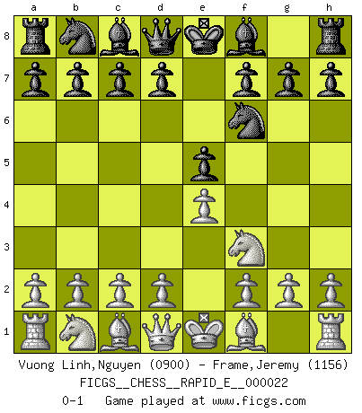 Last move : 0-1 2010 January 24 8:23:55 [Event "FICGS__CHESS__RAPID_E__000022"] [Site "FICGS"] [Date "2009.12.18"] [Round "1"] [White "Vuong Linh,Nguyen"] [Black "Frame,Jeremy"] [Result "0-1"] [WhiteElo "0900"] [BlackElo "1156"] 1.e4 e5 2.Nf3 Nf6 0-1 This chess game has been lost on time (started : 2009.12.18 5:17:19) Petrov's defense Player Black won this chess game. Follow this game move after move (download)I play correspondence chess because it is both art and science while chess is art only. (A player at FICGS) Es hat in meinem Leben Zeiten gegeben, da ich sehr nahe daran war zu glauben, daß ich auch nicht eine einzige Schachpartie verlieren könnte. (José Raúl Capablanca) Existen dos clases de sacrificios: los correctos y los míos. (Mikhail Tal) Ce qui est bien, c'est d'avoir tout un tas de pièces en prise : l'adversaire ne peut en prendre qu'une à la fois. Cité par Thierry Audin. Without deviation from the norm, progress is not possible. (Frank Zappa)