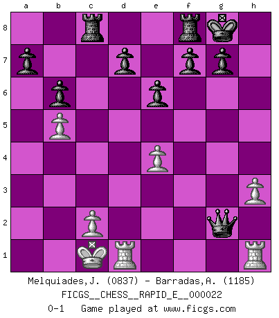 Last move : 0-1 2009 December 21 5:34:13 [Event "FICGS__CHESS__RAPID_E__000022"] [Site "FICGS"] [Date "2009.12.18"] [Round "1"] [White "Melquiades,Jay"] [Black "Barradas,Anderson"] [Result "0-1"] [WhiteElo "0837"] [BlackElo "1185"] 1.e4 c5 2.Nf3 e6 3.d4 cxd4 4.Nxd4 Bc5 5.Be3 b6 6.Nc3 Nc6 7.Ndb5 Bb4 8.a3 Bxc3+ 9.Nxc3 Nf6 10.h3 O-O 11.g4 h6 12.g5 hxg5 13.Bxg5 Ne5 14.Bxf6 Qxf6 15.Nb5 Nf3+ 16.Ke2 Ba6 17.Bg2 Bxb5+ 18.Ke3 Ne5 19.a4 Nc4+ 20.Kd3 Nxb2+ 21.Kd2 Nxd1 22.Raxd1 Qxf2+ 23.Kc1 Qxg2 24.axb5 Rac8 0-1 Sicilian defense Kingside Castling by player Black (move 10) Player Black won this chess game. Follow this game move after move (download)A bad plan is better than none at all. (Frank Marshall) Schach ist wie eine schöne Frau, zu der wir ständig zurückkehren, gleichviel, wie oft sie uns zurückweist. (Anonymous) La única cosa que los jugadores de Ajedrez tienen en común, es el Ajedrez. (Lodewijk Prins) Les Echecs sont et restent toujours un combat, un combat intégral comme la boxe, la lutte ou un autre sport, et où il doit y avoir un vainqueur et un vaincu. (Joseph Emil Diemer) Follow your passion, and success will follow you. (Arthur Buddhold)