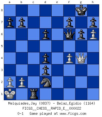Last move : 0-1 2010 January 25 15:42:58 [Event "FICGS__CHESS__RAPID_E__000022"] [Site "FICGS"] [Date "2009.12.18"] [Round "1"] [White "Melquiades,Jay"] [Black "Belaz,Egidio"] [Result "0-1"] [WhiteElo "0837"] [BlackElo "1164"] 1.e4 e5 2.Nf3 d6 3.h3 Nf6 4.Nc3 Be7 5.d3 O-O 6.g4 Nc6 7.g5 Nh5 8.Nd5 g6 9.h4 Nd4 10.Nxd4 exd4 11.Be2 Ng7 12.h5 Bxg5 13.h6 Ne6 14.Bg4 c6 15.Bxg5 Nxg5 16.Bxc8 Rxc8 17.Nf4 Qf6 18.Qg4 Qe5 19.O-O-O c5 20.Nd5 c4 21.Nf6+ Qxf6 22.Rdf1 cxd3 23.f4 Rxc2+ 24.Kb1 Nxe4 25.Rfg1 Rfc8 26.Rc1 Nd2+ 27.Ka1 Rxc1+ 28.Rxc1 Rxc1+ 0-1 Philidor's defense Kingside Castling by player Black (move 5) Queenside Castling by player White (move 19) Player Black won this chess game. Follow this game move after move (download)I feel as if I were a piece in a game of Chess, when my opponent says of it: That piece cannot be moved. (Soren Kierkegaard) Wer nie einen Fehler gemacht hat, hat nie etwas Neues ausprobiert. (Albert Einstein) Los finales de Peón son del Ajedrez lo que el cesped es del Golf. (Cecil Purdy) À la honte des hommes, on sait que les lois du jeu sont les seules qui soient partout justes, claires, inviolables et exécutées. Pourquoi l'Indien qui a donné les règles du jeu d'échecs est-il obéi de bon gré dans toute la terre, et que les décrétales des papes, par exemple, sont aujourd'hui un objet d'horreur et de mépris ? C'est que l'inventeur des échecs combina tout avec justesse pour la satisfaction des joueurs, et que les papes, dans leurs décrétales, n'eurent en vue que leur seul avantage. L'Indien voulut exercer également l'esprit des hommes et leur donner du plaisir; les papes ont voulu abrutir l'esprit des hommes. Voltaire (Dictionnaire philosophique / Garnier 1967) Every vice is only an exaggeration of a necessary and virtuous function. (Ralph Waldo Emerson, Journals 1936)