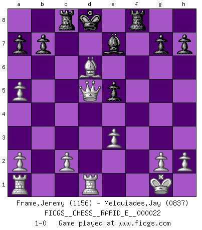Last move : 1-0 2010 January 16 5:15:24 [Event "FICGS__CHESS__RAPID_E__000022"] [Site "FICGS"] [Date "2009.12.18"] [Round "1"] [White "Frame,Jeremy"] [Black "Melquiades,Jay"] [Result "1-0"] [WhiteElo "1156"] [BlackElo "0837"] 1.e4 e5 2.Nf3 d6 3.Nc3 f6 4.d4 Nc6 5.dxe5 fxe5 6.Bc4 Nge7 7.Ng5 Kd7 8.Be6+ Ke8 9.Bf7+ Kd7 10.Ne6 Nd4 11.Nxd8 Kxd8 12.Bb3 Be6 13.Be3 Ndc6 14.Bxe6 Na5 15.Nd5 Nxd5 16.Bxd5 c6 17.b4 cxd5 18.bxa5 dxe4 19.O-O Be7 20.Qd5 Rb8 21.Rfd1 Rf8 22.Bc5 e3 23.fxe3 Rc8 24.Bxd6 1-0 Philidor's defense Kingside Castling by player White (move 19) Player White won this chess game. Follow this game move after move (download)Daring ideas are like Chess men moved forward. They may be beaten, but they may start a winning game. (Johann Wolfgang von Goethe) Taktik ist was man tun muß, wenn etwas zu tun ist. Strategie ist was man tun muß, wenn nichts zu tun ist. (Savielly Grigorievitsch Tartakower) El ganador de una partida es aquel jugador que hace el penúltimo error. (Savielly Tartakover) Les Echecs, c'est l'art de la guerre sans les charniers, c'est la résurrection des morts tombés au champ d'honneur, l'espoir perpétuel, la suprématie de l'intelligence sur la force, la culture de l'esprit. (F. Szpiner) The real voyage of discovery consists not in seeking new lands but in seeing with new eyes. (Marcel Proust)