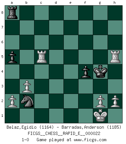 Last move : 1-0 2010 January 6 20:0:49 [Event "FICGS__CHESS__RAPID_E__000022"] [Site "FICGS"] [Date "2009.12.18"] [Round "1"] [White "Belaz,Egidio"] [Black "Barradas,Anderson"] [Result "1-0"] [WhiteElo "1164"] [BlackElo "1185"] 1.e4 e5 2.f4 exf4 3.Nf3 d5 4.Nc3 dxe4 5.Nxe4 Bg4 6.Bc4 Bxf3 7.Qxf3 Bd6 8.O-O Nf6 9.Nxd6+ Qxd6 10.d3 g5 11.Qxb7 Qb6+ 12.Qxb6 axb6 13.Re1+ Kd7 14.Bxf7 Ra5 15.Bd2 Nc6 16.Bxa5 bxa5 17.Bb3 Nd4 18.Re5 Nxb3 19.cxb3 Ra8 20.Rxg5 c6 21.Rf5 Nd5 22.Rf7+ Ke6 23.Rxh7 Nb4 24.Re1+ Kf5 25.Rc1 Nxd3 26.Rxc6 Nxb2 27.Rh5+ Kg4 28.R6c5 1-0 KGA : Abbazia defense (Classical defense, Modern defense!) Kingside Castling by player White (move 8) Player White won this chess game. Follow this game move after move (download)Pawn endings are to Chess what putting is to golf. (Cecil Purdy) Am wohlsten fühle ich mich, wenn ich sehe, wie sich mein Gegner im Todeskampf windet. (Robert James Fischer) Jugadores de primera clase pierden en contra de jugadores de segunda clase porque los jugadores de segunda clase a veces juegan una partida de primer clase. (Siegbert Tarrasch) Mais l'homme est une créature légère et illogique : semblable au joueur d'échecs, il n'aime que le processus du but à atteindre, non le but lui-même. (Dostoïevsky) Luck is the residue of design. (John Milton)