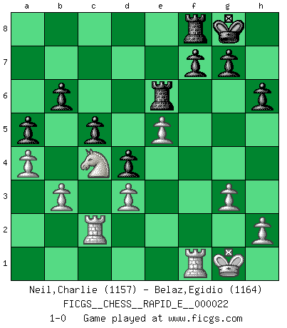 Last move : 1-0 2010 February 23 13:0:47 [Event "FICGS__CHESS__RAPID_E__000022"] [Site "FICGS"] [Date "2009.12.18"] [Round "1"] [White "Neil,Charlie"] [Black "Belaz,Egidio"] [Result "1-0"] [WhiteElo "1157"] [BlackElo "1164"] 1.e4 c5 2.Nf3 d6 3.Bb5+ Bd7 4.Bxd7+ Nxd7 5.d3 Ngf6 6.Nc3 e5 7.Bg5 Be7 8.Qe2 O-O 9.O-O h6 10.Bxf6 Bxf6 11.Nd5 Nb6 12.Nxf6+ Qxf6 13.b3 a5 14.a4 Rfe8 15.Nd2 Rad8 16.Qg4 Qe6 17.Qxe6 Rxe6 18.Rae1 d5 19.g3 d4 20.f4 exf4 21.Rxf4 Nd5 22.Rf3 Nb4 23.Rc1 Na2 24.Rcf1 Rf8 25.Nc4 b6 26.e5 Nb4 27.R3f2 Nxc2 28.Rxc2 1-0 Sicilian : Canal-Sokolsky attack, 3...Bd7 Kingside Castling by player Black (move 8) Kingside Castling by player White (move 9) Player White won this chess game. Follow this game move after move (download)Morphy was probably the greatest genius of them all. (Bobby Fischer) Das Schachspiel übertrifft alle anderen Spiele so weit wie der Chimborasso einen Misthaufen. (Arthur Schopenhauer) Tu sabes que vas a perder. Aún cuando tenía la ventaja, yo sabía que iba a perder. - al estar jugando con Fischer (Andrew Soltis) Je menace de comprendre la position. (Anonyme) In every real man a child is hidden that wants to play. (Friedrich Nietzsche)