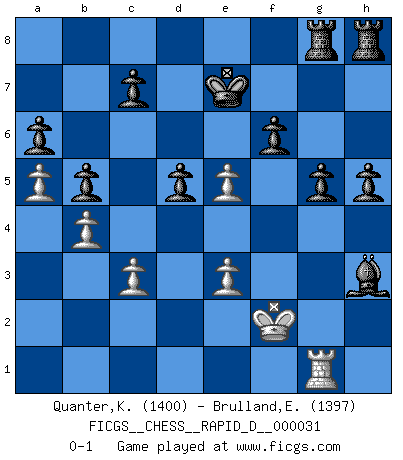 Last move : 0-1 2009 December 22 20:23:41 [Event "FICGS__CHESS__RAPID_D__000031"] [Site "FICGS"] [Date "2009.12.18"] [Round "1"] [White "Quanter,Kirsty"] [Black "Brulland,Emmanuel"] [Result "0-1"] [WhiteElo "1400"] [BlackElo "1397"] 1.d4 d5 2.Nc3 Nf6 3.Bf4 a6 4.Be5 e6 5.e3 Nbd7 6.g4 h6 7.Bg2 Nxe5 8.h4 Nc4 9.Rb1 Be7 10.b3 Nd6 11.Nf3 Nxg4 12.Bh3 Nf6 13.Ne2 Nfe4 14.a4 Bxh4 15.Nxh4 Qxh4 16.Rh2 Nxf2 17.Rxf2 Qxh3 18.Nf4 Qh1+ 19.Rf1 Qh4+ 20.Rf2 Ne4 21.Qe2 Nxf2 22.Qxf2 Qxf2+ 23.Kxf2 Ke7 24.Rg1 g6 25.Ke2 Bd7 26.Kd3 b5 27.a5 Rac8 28.b4 h5 29.c3 Rcg8 30.Nh3 f6 31.Ke2 g5 32.Kf2 e5 33.dxe5 Bxh3 0-1 Queen's pawn : Chigorin variation Player Black won this chess game. Follow this game move after move (download)If a ruler does not understand Chess, how can he rule over a kingdom ? (King Khusros II) Wir können eben der zündenden Macht des Opfers nicht wiederstehen, denn die Begeisterung für das Opfer liegt in der Natur des Menschen. (Rudolf Spielmann) El Ajedrez es un juego terrible. Si no dominas el centro, tu oponente tiene una posición mas libre. Si tu tienes el centro, entonces realmente tienes algo de que preocuparte. (Siegbert Tarrasch) Demandez au pauvre Cg1 ce qu'il en pense. Eduard Gufeld à propos de la variante Saemisch de l'Est-Indienne. A shortcut is the longest distance between two points. (Don Groves)
