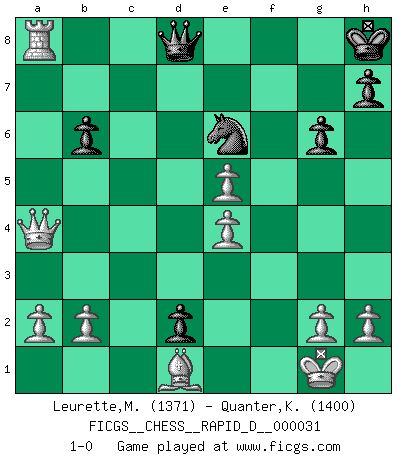 Last move : 1-0 2010 January 8 7:43:24 [Event "FICGS__CHESS__RAPID_D__000031"] [Site "FICGS"] [Date "2009.12.18"] [Round "1"] [White "Leurette,Marc-Antoine"] [Black "Quanter,Kirsty"] [Result "1-0"] [WhiteElo "1371"] [BlackElo "1400"] 1.e4 e5 2.Nf3 Nc6 3.d4 f6 4.dxe5 Nxe5 5.Nxe5 fxe5 6.Bd2 Nf6 7.Nc3 d5 8.Bd3 d4 9.Ne2 c5 10.c3 Be7 11.cxd4 cxd4 12.Ng3 O-O 13.Bc4+ Kh8 14.O-O Bg4 15.f3 Bd7 16.Qb3 Rc8 17.Rac1 b6 18.Be6 Bd6 19.Rxc8 Bxc8 20.Nf5 Ba6 21.Rc1 g6 22.Nxd6 Qxd6 23.Bb4 Qd8 24.Bxf8 Qxf8 25.Rc7 d3 26.Qc3 Qd6 27.Bb3 Ne8 28.Rxa7 Bb5 29.f4 d2 30.Bd1 Kg8 31.fxe5 Qd8 32.Qb3+ Kh8 33.Qxb5 Ng7 34.Qa4 Ne6 35.Ra8 1-0 Scotch Opening Kingside Castling by player Black (move 12) Kingside Castling by player White (move 14) Player White won this chess game. Follow this game move after move (download)Good offense and good defense both begin with good development. (Bruce A. Moon) Im Fernschach kannst du während dem Spiel rauchen. (John Christen Knudsen) Aquel que teme a un Peón de Reina aislado, debería de retirarse del Ajedrez. (Siegbert Tarrasch) Les réformistes prétendent que les progrès de la théorie conduiront à la disparition des échecs, et qu'il faut, pour leur rendre vie, en remanier les règles. En réalité, qu'exprime cette affirmation? Le mépris de l'intuition, de l'imagination et de tous les autres éléments qui font des échecs un art. (Alexander Alekhine) Beep ! (R2D2 in Star Wars ep.3)