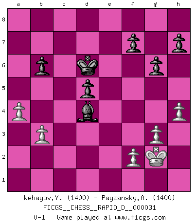 Last move : 0-1 2009 December 19 14:58:3 [Event "FICGS__CHESS__RAPID_D__000031"] [Site "FICGS"] [Date "2009.12.18"] [Round "1"] [White "Kehayov,Yulian"] [Black "Payzansky,Aleksey"] [Result "0-1"] [WhiteElo "1400"] [BlackElo "1400"] 1.e4 c5 2.Nf3 d6 3.d3 g6 4.Be2 Bg7 5.O-O Nc6 6.c3 Nf6 7.b3 O-O 8.d4 cxd4 9.cxd4 b6 10.Nc3 Bb7 11.e5 dxe5 12.dxe5 Ng4 13.Qxd8 Rfxd8 14.h3 Ngxe5 15.Nxe5 Nxe5 16.Bf4 Rac8 17.Nb5 a6 18.Rac1 axb5 19.Rxc8 Rxc8 20.Bxb5 Bf6 21.Re1 Rc5 22.a4 Nc6 23.Be3 Rc3 24.Rc1 Rxc1+ 25.Bxc1 Nd4 26.Bc4 e6 27.Be3 Kf8 28.Bxd4 Bxd4 29.g3 Bd5 30.Bxd5 exd5 31.Kg2 Ke7 32.h4 Kd6 0-1 Sicilian Kingside Castling by player White (move 5) Kingside Castling by player Black (move 7) Player Black won this chess game. Follow this game move after move (download)Chess is a cold bath for the mind. (Sir John Simon) Wie kann ich Remis annehmen? Ich weiß ja gar nicht, wie ich stehe! (Fritz Sämisch) El Ajedrez es el juego mas altamente simbólico, pero las agresiones estan por lo tanto aún mas francamente representadas en la partida. Tal vez comenzo como un juego de guerra; Algo como la representación de una batalla en miniatura entre las fuerzas de dos reinos. (Karl Meninger) Ce qui est bien, c'est d'avoir tout un tas de pièces en prise : l'adversaire ne peut en prendre qu'une à la fois. Cité par Thierry Audin. Creativity involves breaking out of established patterns in order to look at things in a different way. (Edward De Bono)