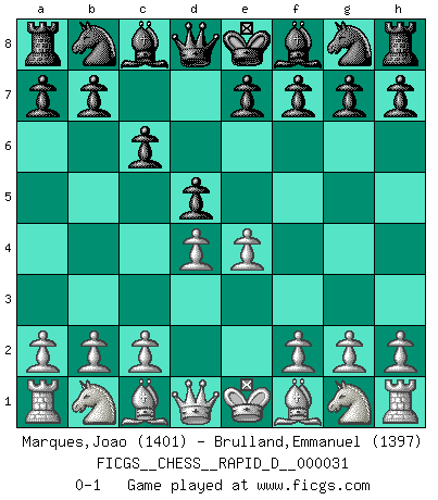 Last move : 0-1 2010 January 18 13:2:32 [Event "FICGS__CHESS__RAPID_D__000031"] [Site "FICGS"] [Date "2009.12.18"] [Round "1"] [White "Marques,Joao"] [Black "Brulland,Emmanuel"] [Result "0-1"] [WhiteElo "1401"] [BlackElo "1397"] 1.e4 c6 2.d4 d5 0-1 Caro-Kann defense Player Black won this chess game. Follow this game move after move (download)Fischer, who may or may not be mad as a hatter, has every right to be horrified. (Jeremy Silman) Wenn ich Weiß habe gewinne ich weil ich Weiß habe, wenn ich Schwarz habe gewinne ich weil ich Bogoljubov bin. (Efim Bogoljubov) Si el ingenio solamente fuese necesario para lucirse, las mujeres serían las mejores jugadoras de Ajedrez del mundo. (Albin) J'ai toujours senti une vague pitié pour l'homme qui ne connaît rien aux échecs, tout comme j'en aurais pour un homme ignorant de l'amour. Les Echecs, comme la musique ou comme l'amour, ont le pouvoir de rendre heureux. (Siegbert Tarrasch) Work expands to fill the time available. (C. Northcote Parkinson, in Parkinson's Laws)