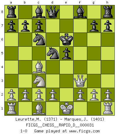 Last move : 1-0 2010 February 9 8:25:0 [Event "FICGS__CHESS__RAPID_D__000031"] [Site "FICGS"] [Date "2009.12.18"] [Round "1"] [White "Leurette,Marc-Antoine"] [Black "Marques,Joao"] [Result "1-0"] [WhiteElo "1371"] [BlackElo "1401"] 1.e4 e5 2.Nf3 Nc6 3.Bc4 Nf6 4.Ng5 d5 5.exd5 Nxd5 6.Nxf7 Kxf7 7.Qf3+ Ke6 8.Nc3 1-0 This chess game has been lost on time (started : 2009.12.18 12:47:43) Two knights defense : Fegatello attack Player White won this chess game. Follow this game move after move (download)Up to this point White has been following well-known analysis. But now he makes a fatal error: he begins to use his own head. (Siegbert Tarrasch) Bis jetzt ist Weiß einer wohlbekannten Analyse gefolgt. Aber jetzt begeht er einen schrecklichen Fehler: Er beginnt seinen eigenen Kopf zu benutzen. (Siegbert Tarrasch) Al jugar al Ajedrez entonces, podemos aprender: Primero: Previsión... Segundo: Prudencia... Tercero: Cautela... Y al final, aprendemos del Ajedrez el hábito de no ser desanimados por apariencias malas presentes en el estado de nuestros asuntos, el hábito de la esperanza por una oportunidad favorable y la perseveración de los secretos de los recursos. (Benjamin Franklin) Vous savez, camarade Pachman, je n'éprouve pas de plaisir à être ministre, je jouerais plutôt aux échecs comme vous, ou alors ferais une révolution au Venezuela. (Che Guevara à Ludek Pachman, 'Checkmate in Prague', 1975) I find your interest interesting. (Gregory House, House M.D.)