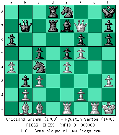 Last move : 1-0 2006 July 2 11:57:40 [Event "FICGS__CHESS__RAPID_B__000003"] [Site "FICGS"] [Date "2006.04.23"] [Round "1"] [White "Cridland,Graham"] [Black "Agustin,Santos"] [Result "1-0"] [WhiteElo "1700"] [BlackElo "1400"] 1.e4 e5 2.Nf3 Nc6 3.Bb5 a6 4.Ba4 Nf6 5.O-O b5 6.Bb3 Be7 7.Re1 O-O 8.d3 Bb7 9.Nbd2 d6 10.c3 Na5 11.Bc2 Ng4 12.h3 Nf6 13.Nf1 c5 14.Ne3 Nc6 15.Nf5 Bc8 16.g4 Qc7 17.Be3 Bf5 18.gxf5 d5 19.Kh1 dxe4 20.dxe4 Rad8 21.Qe2 Rd7 22.Rg1 Rfd8 23.a4 Qb7 24.Bh6 Ne8 25.Nh2 b4 26.Rae1 Kh8 27.Bc1 b3 28.Bb1 f6 29.Qh5 Na5 30.Ng4 Nc4 31.Nh6 gxh6 32.Qf7 1-0 Ruy Lopez : 5.O-O Kingside Castling by player White (move 5) Kingside Castling by player Black (move 7) Player White won this chess game. Follow this game move after move (download)For me, Chess is life and every game is like a new life. Every Chess player gets to live many lives in one lifetime. (Eduard Gufeld) Das Schachspiel ist ein See, in welchem eine Mücke baden und ein Elefant ertrinken kann. (Emanuel Lasker) Fischer era un maestro de claridad y un Rey del posicionamiento astuto. Sus oponentes podían ver hacia donde se dirigía pero eran impotentes para detenerlo. (Bruce Pandolfini) C'est une question de caractère, Beaucoup de gens perdent leur motivation très vite. D'autres, ils sont rares, peuvent la conserver très longtemps. J'aime les échecs, encore aujourd'hui je suis heureux d'analyser des parties. J'aime toujours gagner, je déteste encore perdre. Bien jouer est important pour mon intégrité intellectuelle et morale. Et puis les échecs vivent en ce moment une période historique grâce à Internet. Ils se développent dans les systèmes éducatifs à travers le monde. Ils sortent de leur ghetto, et c'est mon rôle de mener à bien cette révolution. (Gary Kasparov) You can't play chess if you're groggy from pills. (Anatoly Karpov)