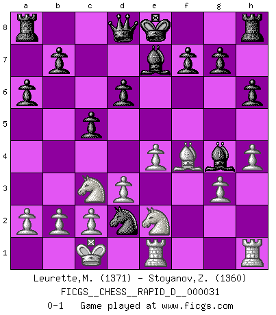 Last move : 0-1 2009 December 21 14:5:54 [Event "FICGS__CHESS__RAPID_D__000031"] [Site "FICGS"] [Date "2009.12.18"] [Round "1"] [White "Leurette,Marc-Antoine"] [Black "Stoyanov,Zdravko"] [Result "0-1"] [WhiteElo "1371"] [BlackElo "1360"] 1.e4 c5 2.Nc3 Nc6 3.g3 a6 4.Bg2 e6 5.d3 h6 6.Be3 d6 7.Qd2 Nf6 8.O-O-O e5 9.f4 exf4 10.Bxf4 Be7 11.h4 Bg4 12.Re1 Nd4 13.Bh3 Bf3 14.Rh2 Ng4 15.Bxg4 Bxg4 16.Nge2 Nf3 17.R2h1 Nxd2 0-1 Sicilian : Closed Queenside Castling by player White (move 8) Player Black won this chess game. Follow this game move after move (download)What would Chess be without silly mistakes ? (Kurt Richter) Es hat in meinem Leben Zeiten gegeben, da ich sehr nahe daran war zu glauben, daß ich auch nicht eine einzige Schachpartie verlieren könnte. (José Raúl Capablanca) Yo adoro todas la posiciones. Denme una partida posicional difícil, y la jugaré. Pero posiciones totalmente ganadas, no las tolero. (Hein Donner) A ce moment-là, je menaçais de comprendre la position ! (Clément L'Heureux) All war is based on deception. (Sun Tzu)