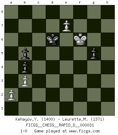 Last move : 1-0 2009 December 22 10:20:29 [Event "FICGS__CHESS__RAPID_D__000031"] [Site "FICGS"] [Date "2009.12.18"] [Round "1"] [White "Kehayov,Yulian"] [Black "Leurette,Marc-Antoine"] [Result "1-0"] [WhiteElo "1400"] [BlackElo "1371"] 1.e3 e5 2.d3 d5 3.Nc3 Nf6 4.d4 Nc6 5.dxe5 Nxe5 6.Nf3 Nxf3+ 7.Qxf3 Bg4 8.Qg3 Qd6 9.Qxd6 Bxd6 10.h3 Bf5 11.f3 Bxc2 12.b3 Bb4 13.Bd2 Ba3 14.Nb5 Bb2 15.Nxc7+ Kd7 16.Nxa8 Bxa1 17.Bb5+ Kd6 18.Bb4+ Ke6 19.Nc7+ Kf5 20.g4+ Kg6 21.O-O Be5 22.Rc1 Bxc7 23.Rxc2 Bb6 24.Bc5 Rc8 25.Bd3+ Kh6 26.Bxb6 Rxc2 27.Bxc2 axb6 28.h4 Ne8 29.g5+ Kh5 30.Bxh7 Kxh4 31.g6 fxg6 32.Bxg6 Nd6 33.Kf2 b5 34.e4 dxe4 35.Bxe4 Nxe4+ 36.fxe4 Kg5 37.Kf3 Kf6 38.Kf4 b4 39.e5+ Ke6 40.Ke4 b5 41.Kf4 Kd5 42.Kf5 g6+ 43.Kf6 g5 44.e6 Kd6 45.e7 1-0 Van't Kruijs Opening Kingside Castling by player White (move 21) 10 pieces endgame at move 35 : White KBPPP , Black KNPPP WHITE : King + 1 Bishop 3 Pawns BLACK : King + 1 Knight 3 Pawns 9 pieces endgame at move 35 : White KPPP , Black KNPPP WHITE : King + 3 Pawns BLACK : King + 1 Knight 3 Pawns 8 pieces endgame at move 36 : White KPPP , Black KPPP WHITE : King + 3 Pawns BLACK : King + 3 Pawns Player White won this chess game. Follow this game move after move (download)Chess is a fairy tale of 1001 blunders. (Savielly Tartakower) Wenn sie aufgeben, dann danke ich Ihnen für das Spiel (Eventualzug beim Fernschach). (Anonymous) Aquel que teme a un Peón de Reina aislado, debería de retirarse del Ajedrez. (Siegbert Tarrasch) On peut tirer plus d'utilité d'une partie perdue que de 100 parties gagnées. (Capablanca) I know the human being and fish can coexist peacefully. (George W. Bush, Saginaw sept. 29, 2000)