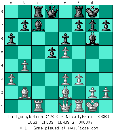 Last move : 0-1 2007 January 1 9:21:51 [Event "FICGS__CHESS__CLASS_G__000007"] [Site "FICGS"] [Date "2006.10.08"] [Round "1"] [White "Daligcon,Nelson"] [Black "Nistri,Paolo"] [Result "0-1"] [WhiteElo "1200"] [BlackElo "0800"] 1.d4 d5 2.c4 c6 3.Nc3 Nf6 4.Nf3 Bf5 5.e3 e6 6.Be2 Bb4 7.O-O O-O 8.a3 Ba5 9.b4 Bc7 10.cxd5 cxd5 11.Bb2 Nc6 12.Rc1 a6 13.Na4 Rc8 14.Nc5 Rb8 15.Ne5 Nxe5 16.dxe5 Ne4 17.Nxe4 Bxe4 18.f3 Bg6 19.Qe1 Rc8 0-1 This chess game has been lost on time (started : 2006.10.08 6:33:49) QGD Slav defense Kingside Castling by player White (move 7) Kingside Castling by player Black (move 7) Player Black won this chess game. Follow this game move after move (download)Discovered check is the dive bomber of the Chessboard. (Reuben Fine) Ich habe die besten Aussichten, den ersten Preis zu gewinnen - denn jeder muss gegen Steinitz spielen, nur ich nicht! (Wilhelm Steinitz) Debemos de asegurarnos de que el Ajedrez no se convierta en un lenguaje muerto, muy interesante, pero solo para un grupo muy pequeño. (Sytze Faber) Toutes choses étant égales, c'est la conviction qui gagne. Alliée à une volonté de vaincre, elle sert de détonateur, suscite des idées, disperse les doutes et aide à penser clairement. (Robert Fischer) The Internet isn't free. It just has an economy that makes no sense to capitalism. (Brad Shapcott)