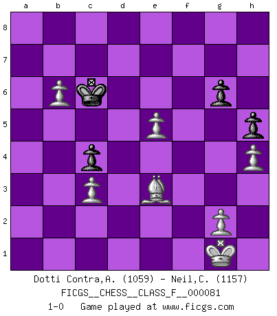 Last move : 1-0 2010 April 7 19:18:36 [Event "FICGS__CHESS__CLASS_F__000081"] [Site "FICGS"] [Date "2009.12.19"] [Round "1"] [White "Dotti Contra,Alessandro"] [Black "Neil,Charlie"] [Result "1-0"] [WhiteElo "1059"] [BlackElo "1157"] 1.e4 c5 2.Nf3 Nc6 3.Bb5 e6 4.O-O a6 5.Ba4 b5 6.Bb3 c4 7.Nc3 cxb3 8.axb3 Qc7 9.d4 Nf6 10.d5 e5 11.dxc6 dxc6 12.h3 Bb4 13.Bd2 O-O 14.Bg5 Nd7 15.Bh4 f6 16.Qd2 Rd8 17.Qe3 Bb7 18.Rad1 Bc5 19.Rxd7 Rxd7 20.Qxc5 Rad8 21.Qe3 a5 22.Qc5 Kh8 23.b4 axb4 24.Qxb4 Rd6 25.Ra1 Qb6 26.Qa5 Qxa5 27.Rxa5 Ra8 28.Rxa8+ Bxa8 29.b4 Rd7 30.Ne1 Rd2 31.f3 Bb7 32.Nb1 Rd1 33.Nc3 Rxe1+ 34.Bxe1 h5 35.h4 Kh7 36.Bd2 Kg8 37.f4 Kf7 38.fxe5 fxe5 39.Bg5 Bc8 40.Ne2 Bg4 41.Ng3 Bd1 42.c3 Kg6 43.Nf5 Bb3 44.Ne7+ Kf7 45.Nxc6 Bc4 46.Nxe5+ Ke6 47.Nxc4 bxc4 48.b5 Kd6 49.b6 Kc6 50.Be3 g6 51.e5 1-0 Sicilian : Nimzovich-Rossolimo attack (without ...d6) Kingside Castling by player White (move 4) Kingside Castling by player Black (move 13) Player White won this chess game. Follow this game move after move (download)Discovered check is the dive bomber of the Chessboard. (Reuben Fine) Ich erzeugte keinen Neid, da mich die Schachspieler als Musiker und die Musiker als Schachspieler betrachteten. (Mark Taimanov) Yo siempre he tenido un ligero sentimiento de lástima por una persona que no tiene conocimiento del Ajedrez. (Siegbert Tarrasch) Les Echecs ont trois composantes : le temps, l'espace et le matériel en dernier. (Mikhail Tal) Remember : Your focus determines your reality. (Qui-Gon Jinn in Star Wars ep.1)