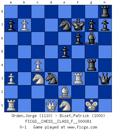 Last move : 0-1 2010 March 22 0:10:37 [Event "FICGS__CHESS__CLASS_F__000081"] [Site "FICGS"] [Date "2009.12.19"] [Round "1"] [White "Orden,Jorge"] [Black "Bizet,Patrick"] [Result "0-1"] [WhiteElo "1110"] [BlackElo "1000"] 1.e4 d5 2.exd5 Qxd5 3.Nf3 Bg4 4.Be2 e5 5.c4 Qa5 6.Nc3 Bc5 7.O-O Ne7 8.a3 c6 9.d3 Nd7 10.Bg5 f6 11.Be3 Bxe3 12.fxe3 Qb6 13.b4 Qxe3+ 14.Kh1 Rd8 15.h3 Bh5 16.b5 Nc5 17.g4 Bg6 18.Ne1 Qxh3+ 19.Kg1 Rd4 20.bxc6 Nxd3 21.cxb7 Kf7 22.Rf3 Rxg4+ 0-1 Scandinavian (centre counter) defense Kingside Castling by player White (move 7) Player Black won this chess game. Follow this game move after move (download)The Pawns are the soul of the game. (Francois Andre Danican Philidor) Das Spiel gibt uns die Genugtuung, die das Leben uns versagt. (Emanuel Lasker) Las ideas audaces son como las piezas del Ajedrez que avanzan hacia adelante. Ellas pueden ser vencidas, pero también pueden iniciar una partida victoriosa. (Goethe) Psychologiquement, tu dois avoir confiance en toi même, mais cette confiance doit être basée sur des faits. (Robert Fischer) You have to believe in yourself. (Sun Tzu)