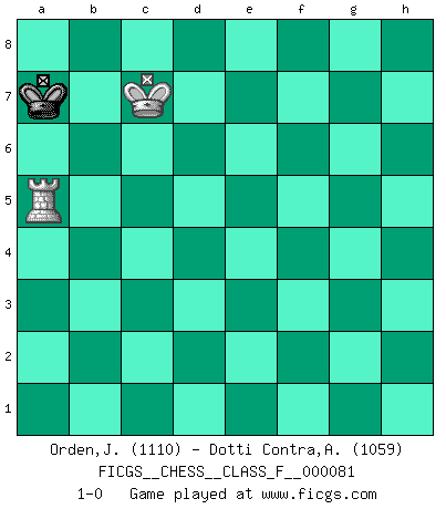 Last move : 1-0 2010 May 7 17:39:26 [Event "FICGS__CHESS__CLASS_F__000081"] [Site "FICGS"] [Date "2009.12.19"] [Round "1"] [White "Orden,Jorge"] [Black "Dotti Contra,Alessandro"] [Result "1-0"] [WhiteElo "1110"] [BlackElo "1059"] 1.e4 e5 2.Nf3 Nc6 3.d4 d6 4.dxe5 Nxe5 5.Nxe5 dxe5 6.Bc4 Qxd1+ 7.Kxd1 Nh6 8.Bxh6 gxh6 9.Ke2 Bg4+ 10.f3 Bd7 11.Rd1 O-O-O 12.Bxf7 Bb5+ 13.Ke1 Bb4+ 14.c3 Bc5 15.b4 Rxd1+ 16.Kxd1 Ba4+ 17.Ke2 Bb5+ 18.Ke1 Be3 19.c4 Rf8 20.Be6+ Bd7 21.Bxd7+ Kxd7 22.Nc3 a6 23.Rd1+ Ke6 24.Nd5 Bd4 25.Ke2 c6 26.Nc7+ Kd6 27.Nxa6 bxa6 28.c5+ Ke6 29.g3 Bc3 30.Rd6+ Ke7 31.Rxc6 Rd8 32.Rxa6 Rd2+ 33.Ke3 Rxh2 34.Rb6 Bd4+ 35.Kd3 Rf2 36.a4 Rxf3+ 37.Kc4 Ra3 38.Rxh6 Rxg3 39.Rxh7+ Kd8 40.c6 Ra3 41.Kb5 Re3 42.c7+ Kc8 43.Kc6 Rc3+ 44.Kd6 Rc4 45.Rh8+ Kb7 46.Rb8+ Ka7 47.c8Q Rxc8 48.Rxc8 Kb7 49.Kd7 Kb6 50.Rc6+ Kb7 51.b5 Be3 52.a5 Ka7 53.Rc7+ Kb8 54.b6 Bxb6 55.Rc8+ Kb7 56.Re8 Bxa5 57.Rxe5 Bc3 58.Re8 Kb6 59.e5 Bxe5 60.Rxe5 Ka6 61.Kc6 Ka7 62.Rb5 Ka8 63.Kc7 Ka7 64.Ra5+ 1-0 Scotch Opening Queenside Castling by player Black (move 11) 10 pieces endgame at move 39 : White KRPPPP , Black KRBP WHITE : King + 1 Rook 4 Pawns BLACK : King + 1 Rook 1 Bishop 1 Pawn Promotion Queen by player White (move 47) 9 pieces endgame at move 47 : White KRPPP , Black KRBP WHITE : King + 1 Rook 3 Pawns BLACK : King + 1 Rook 1 Bishop 1 Pawn 8 pieces endgame at move 48 : White KRPPP , Black KBP WHITE : King + 1 Rook 3 Pawns BLACK : King + 1 Bishop 1 Pawn 7 pieces endgame at move 54 : White KRPP , Black KBP WHITE : King + 1 Rook 2 Pawns BLACK : King + 1 Bishop 1 Pawn 6 pieces endgame at move 56 : White KRP , Black KBP WHITE : King + 1 Rook 1 Pawn BLACK : King + 1 Bishop 1 Pawn 5 pieces endgame at move 57 : White KRP , Black KB WHITE : King + 1 Rook 1 Pawn BLACK : King + 1 Bishop 4 pieces endgame at move 59 : White KR , Black KB WHITE : King + 1 Rook BLACK : King + 1 Bishop 3 pieces endgame at move 60 : White KR , Black K WHITE : King + 1 Rook BLACK : King + Player White won this chess game. Follow this game move after move (download)All I want to do, ever, is just play Chess. (Bobby Fischer) Fischer ist das größte Genie, das je vom Schachhimmel heruntergestiegen ist. (Mikhail Nekhemyevich Tal) El pensamiento metódico es mas útil en el Ajedrez que la inspiración. (C. J. S. Purdy) En blitz, le Cavalier l'emporte sur le Fou. (Vlastimil Hort) Pushing plastic is for the many, pushing virtual pieces is for the fewer, pushing wood is for the very few. (Normajean Yates)