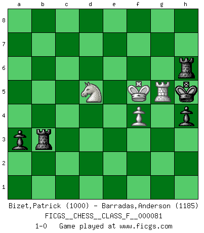 Last move : 1-0 2010 April 1 0:39:28 [Event "FICGS__CHESS__CLASS_F__000081"] [Site "FICGS"] [Date "2009.12.19"] [Round "1"] [White "Bizet,Patrick"] [Black "Barradas,Anderson"] [Result "1-0"] [WhiteElo "1000"] [BlackElo "1185"] 1.e4 e5 2.d4 exd4 3.Qxd4 Nc6 4.Qd3 Nf6 5.Bg5 Be7 6.f4 Nb4 7.Qd2 Nxe4 8.Bxe7 Qxe7 9.Qe2 O-O 10.Na3 d5 11.O-O-O Nxa2+ 12.Kb1 Nb4 13.c3 Bf5 14.Ka1 Nc6 15.Rxd5 g6 16.g4 Nxc3 17.Qxe7 Nxe7 18.Rxf5 gxf5 19.bxc3 c6 20.gxf5 Nxf5 21.Nf3 Rad8 22.Rg1+ Kh8 23.Ne5 Rd1+ 24.Kb2 Ne3 25.Nd7 Rxd7 26.Bh3 Rd2+ 27.Kb3 Rxh2 28.Bf1 Nxf1 29.Rxf1 f5 30.Nc4 h5 31.Ne5 Kg7 32.Rg1+ Kh6 33.Rg6+ Kh7 34.Rd6 Rg2 35.Rd7+ Rg7 36.Rd2 Re8 37.Rh2 Kh6 38.Kc4 Re6 39.Kd3 a5 40.Kc2 b5 41.Kb3 c5 42.Re2 R6e7 43.Rd2 c4+ 44.Kc2 a4 45.Kb2 Rb7 46.Nc6 Rg6 47.Nd4 b4 48.Nxf5+ Kh7 49.cxb4 Rxb4+ 50.Kc3 Rgb6 51.Rd7+ Kg6 52.Ne7+ Kh6 53.Nd5 Rb3+ 54.Kxc4 Rc6+ 55.Kd4 h4 56.Ra7 a3 57.Ra8 Kh5 58.Ke4 Kg4 59.Rg8+ Kh5 60.Kf5 Rh6 61.Rg5+ 1-0 Centre game Kingside Castling by player Black (move 9) Queenside Castling by player White (move 11) 10 pieces endgame at move 49 : White KRNP , Black KRRPPP WHITE : King + 1 Rook 1 Knight 1 Pawn BLACK : King + 2 Rooks 3 Pawns 9 pieces endgame at move 54 : White KRNP , Black KRRPP WHITE : King + 1 Rook 1 Knight 1 Pawn BLACK : King + 2 Rooks 2 Pawns Player White won this chess game. Follow this game move after move (download)You sit at the board and suddenly your heart leaps. Your hand trembles to pick up the piece and move it. But what Chess teaches you is that you must sit there calmly and think about whether it's really a good idea and whether there are other better ideas. (Stanley Kubrick) Jede Eröffnung ist gut genug um gespielt zu werden, wenn nur ihr Ruf schlecht genug ist. (Savielly Grigorievitsch Tartakower) En el Ajedrez, cuando menos, el valiente hereda la tierra. (Edmar Mednis) Les Echecs ne sont pas pour les âmes timides. Ils requièrent un homme entier, qui ne s'arrête pas aveuglément à ce qui a été déjà établi, mais qui tente individuellement de sonder les profondeurs du jeu. (W. Steinitz) I believe in luck. How else can you explain the success of those you dislike ? (Jean Cocteau)
