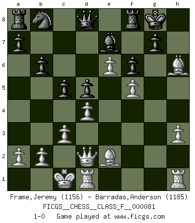 Last move : 1-0 2009 December 27 17:5:1 [Event "FICGS__CHESS__CLASS_F__000081"] [Site "FICGS"] [Date "2009.12.19"] [Round "1"] [White "Frame,Jeremy"] [Black "Barradas,Anderson"] [Result "1-0"] [WhiteElo "1156"] [BlackElo "1185"] 1.e4 c6 2.d4 d5 3.e5 Bf5 4.Nf3 Bg4 5.Be2 e6 6.c3 Ne7 7.Be3 Nf5 8.Nbd2 h6 9.h3 Bxf3 10.Nxf3 Be7 11.Bd2 O-O 12.g4 Nh4 13.Nxh4 Bxh4 14.Be3 b6 15.Qd2 Nd7 16.O-O-O c5 17.f4 Be7 18.f5 exf5 19.gxf5 f6 20.e6 Nb8 21.Bxh6 1-0 Caro-Kann : Advance variation Kingside Castling by player Black (move 11) Queenside Castling by player White (move 16) Player White won this chess game. Follow this game move after move (download)It is not a move, even the best move that you must seek, but a realizable plan. (Eugene Znosko-Borovsky) Ich bin stolz ein Bulgare zu sein. (Veselin Topalov) Todos los Maestros de Ajedrez fueron un día unos principiantes. (Chernev) Aidez vos pièces, elles vous aideront. (Paul Morphy) Beta. Software undergoes beta testing shortly before it's released. Beta is latin for still doesn't work. (Anonymous)