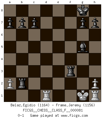 Last move : 0-1 2010 January 18 21:57:32 [Event "FICGS__CHESS__CLASS_F__000081"] [Site "FICGS"] [Date "2009.12.19"] [Round "1"] [White "Belaz,Egidio"] [Black "Frame,Jeremy"] [Result "0-1"] [WhiteElo "1164"] [BlackElo "1156"] 1.e4 e5 2.f4 d5 3.Nc3 exf4 4.Bd3 Qh4+ 5.Ke2 Bc5 6.Qf1 dxe4 7.Nxe4 Qe7 8.Nf3 f5 9.Nfg5 fxe4 10.Nxe4 Nf6 11.Qxf4 Nxe4 12.Qxe4 Qxe4+ 13.Bxe4 O-O 14.d3 Nc6 15.c3 Rf2+ 16.Kd1 Bg4+ 17.Ke1 Re2+ 18.Kf1 Rf8+ 19.Bf3 Rf2+ 20.Ke1 Bxf3 21.gxf3 R8xf3 22.d4 Nxd4 23.cxd4 Bxd4 24.Bg5 Rxb2 25.Rd1 Bf2+ 26.Kf1 Bh4 27.Kg1 Bxg5 0-1 KGD : Falkbeer, Milner-Barry variation Kingside Castling by player Black (move 13) Player Black won this chess game. Follow this game move after move (download)Of all my Russian books, the defense contains and diffuses the greatest 'warmth' which may seem odd seeing how supremely abstract Chess is supposed to be. (Vladimir Nabokov) Schon mancher Spieler hat aufgegeben, um zu vermeiden, daß er eine Figur verliert. (Savielly Grigorievitsch Tartakower) El Ajedrez es tortura mental. (Garry Kasparov) Mais n'est-ce pas déjà le limiter injurieusement que d'appeler les échecs un jeu? N'est-ce pas aussi une science, un art, ou quelque chose qui, comme le cercueil de Mahomet entre ciel et terre, est suspendu entre l'un et l'autre, et qui réunit un nombre incroyable de contraires ? (Stefan Zweig) Without deviation from the norm, progress is not possible. (Frank Zappa)