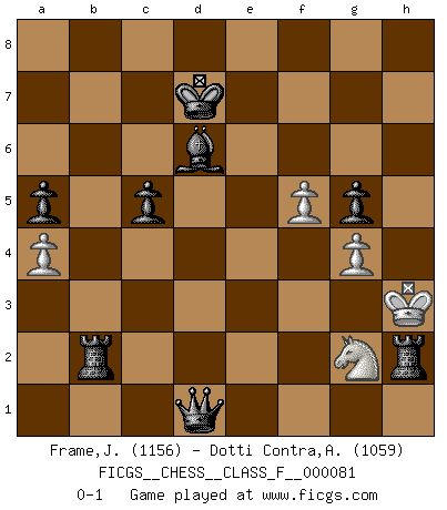Last move : 0-1 2010 January 28 0:7:33 [Event "FICGS__CHESS__CLASS_F__000081"] [Site "FICGS"] [Date "2009.12.19"] [Round "1"] [White "Frame,Jeremy"] [Black "Dotti Contra,Alessandro"] [Result "0-1"] [WhiteElo "1156"] [BlackElo "1059"] 1.e4 e5 2.Nf3 Nc6 3.Bc4 h6 4.c3 d6 5.d4 Be6 6.d5 Bg4 7.dxc6 bxc6 8.h3 Bh5 9.Be3 Nf6 10.Nbd2 d5 11.exd5 cxd5 12.Bb5+ Nd7 13.Qa4 f6 14.Bxd7+ Qxd7 15.Qxd7+ Kxd7 16.O-O Rb8 17.b4 e4 18.a4 a5 19.b5 c5 20.g4 Bf7 21.c4 d4 22.Bf4 Rb6 23.Ne1 g5 24.Bg3 h5 25.Nxe4 Bxc4 26.Nxf6+ Rxf6 27.Ng2 Bxf1 28.Kxf1 d3 29.Ne3 hxg4 30.hxg4 Rh1+ 31.Kg2 Rxa1 32.b6 Rxb6 33.f3 Rb2+ 34.Kh3 Rh1+ 35.Bh2 Bd6 36.Ng2 d2 37.f4 d1Q 38.f5 Rxh2+ 0-1 King's pawn game Kingside Castling by player White (move 16) Promotion Queen by player Black (move 37) Player Black won this chess game. Follow this game move after move (download)If a ruler does not understand Chess, how can he rule over a kingdom ? (King Khusros II) Wer mein Gambit spielt, muß bereit sein, alle Brücken hinter sich abzubrechen. Es verändert den ganzen Menschen. Es wirkt wie ein Zauberstab und fördert verkümmerte, gute Charakter- eigenschaften wieder zu Tage. (Emil Joseph Diemer) Yo siempre he tenido un ligero sentimiento de lástima por una persona que no tiene conocimiento del Ajedrez. (Siegbert Tarrasch) Aux échecs, les retours au sommet sont rares : les dommages psychologiques consécutifs à une défaite sont trop sévères. (Daily Telegraph) They say in chess you've got to kill the queen, and then you mate it... Oh I, do you ? (Red Hot Chili Peppers, Fortune faded)