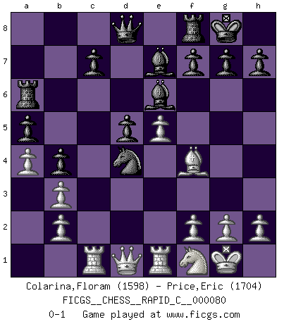 Last move : 0-1 2010 February 14 8:45:39 [Event "FICGS__CHESS__RAPID_C__000080"] [Site "FICGS"] [Date "2009.12.19"] [Round "1"] [White "Colarina,Floram"] [Black "Price,Eric"] [Result "0-1"] [WhiteElo "1598"] [BlackElo "1704"] 1.e4 e5 2.Nf3 Nc6 3.Bb5 a6 4.Ba4 Nf6 5.O-O Nxe4 6.d4 b5 7.Bb3 d5 8.dxe5 Be6 9.Nbd2 Nc5 10.Re1 Be7 11.a4 O-O 12.Nf1 Nxb3 13.cxb3 b4 14.Bf4 a5 15.Rc1 Ra6 16.Nd4 Nxd4 0-1 This chess game has been lost on time (started : 2009.12.19 12:37:56) Ruy Lopez : Open, 7.Bb3 Kingside Castling by player White (move 5) Kingside Castling by player Black (move 11) Player Black won this chess game. Follow this game move after move (download)In the perfect Chess combination as in a first-rate short story, the whole plot and counter-plot should lead up to a striking finale, the interest not being allayed until the very last moment. (Yates and Winter) Garry Kasparov war erst in der Großmeister-Organisation GMA, dann in der Profischach-Vereinigung PCA, zum Schluss kehrte er wieder in den Schoß der FIDE zurück. Aber gut, manche Leute sind flexibel (Viswanathan Anand) Repentinamente, me resultaba obvio en mi analisis que yo había pasado por alto lo que Fischer había visto en el tablero con la mas grande facilidad. (Mikhail Botvinnik) RxDa4 pat (...) If we don't succeed, we run the risk of failure. (George W. Bush)