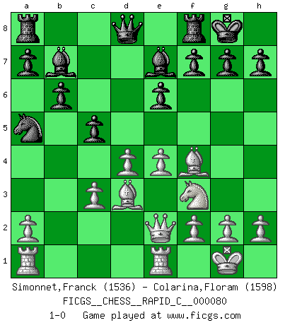 Last move : 1-0 2010 February 7 20:23:22 [Event "FICGS__CHESS__RAPID_C__000080"] [Site "FICGS"] [Date "2009.12.19"] [Round "1"] [White "Simonnet,Franck"] [Black "Colarina,Floram"] [Result "1-0"] [WhiteElo "1536"] [BlackElo "1598"] 1.d4 d5 2.c4 e6 3.Nc3 Nf6 4.cxd5 Nxd5 5.e4 Nxc3 6.bxc3 Be7 7.Nf3 O-O 8.Bc4 b6 9.O-O Bb7 10.Re1 Nc6 11.Bf4 Na5 12.Bd3 c5 13.Qe2 1-0 This chess game has been lost on time (started : 2009.12.19 12:37:56) QGD : Exchange variation Kingside Castling by player Black (move 7) Kingside Castling by player White (move 9) Player White won this chess game. Follow this game move after move (download)With or without the title, Bobby Fischer was unquestionably the greatest player of his time. (Burt Hochberg) Ich kenne Menschen, die allen Willen der Welt besitzen und doch nicht Schach spielen können. (Robert James Fischer) El Ajedrez, como la música, como el amor, tiene el poder de hacer feliz a la gente. (Siegbert Tarrasch) Toutes les manuvres exécutées sur une colonne ouverte ont pour but ultime l'intrusion définitive sur la septième ou la huitième rangée, en plein cur de la position ennemie. (Aaron Nimzovitch) Bobby never cared about money, though. His only desire was to prove that his choices were correct: He wanted chess to be important because he was a chess player, and he wanted to be important. Bobby knew money was important, but he didn't have a clue why, outside of clothes and status. The only way he could accomplish what he wanted was to fight for a lot of money. Once he got it, he gave it away. He did not know how to spend it. And once he'd become champion, after, essentially, sacrificing his life for it, he didn't know how to spend his time. (Bob Wade)
