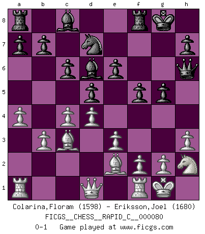 Last move : 0-1 2010 February 19 9:1:52 [Event "FICGS__CHESS__RAPID_C__000080"] [Site "FICGS"] [Date "2009.12.19"] [Round "1"] [White "Colarina,Floram"] [Black "Eriksson,Joel"] [Result "0-1"] [WhiteElo "1598"] [BlackElo "1680"] 1.d4 f5 2.c4 Nf6 3.b3 e6 4.Bb2 d5 5.e3 c6 6.Nf3 Bd6 7.Nc3 O-O 8.Be2 Ne4 9.a4 Nd7 10.O-O Qf6 11.h3 g5 12.Nh2 Nxc3 13.Bxc3 Qh6 0-1 This chess game has been lost on time (started : 2009.12.19 12:37:56) Dutch defense Kingside Castling by player Black (move 7) Kingside Castling by player White (move 10) Player Black won this chess game. Follow this game move after move (download)Botvinnik tried to take the mystery out of Chess, always relating it to situations in ordinary life. He used to call Chess a typical inexact problem similar to those which people are always having to solve in everyday life. (Garry Kasparov) Über Kasparov: Es ist offensichtlich, daß er in einem totalitären Staat aufwuchs und deshalb zu diktatorischen Zügen neigt. (Viktor Kortschnoi) ¿Porque tengo que perder ante este idiota?. (Aron Nimzovich) Assurément je connaissais par expérience le mystérieux attrait de ce jeu royal, le seul entre tous les jeux inventés par les hommes qui échappe souverainement à la tyrannie du hasard, le seul où l'on ne doive sa victoire qu'à son intelligence ou plutôt à une certaine forme d'intelligence. Mais n'est-ce pas déjà le limiter injurieusement que d'appeler les échecs un jeu ? N'est-ce pas une science, un art ou quelque chose qui, comme le cercueil de Mahomet entre ciel et terre, est suspendu entre l'un et l'autre, et qui réunit un nombre incroyable de contraires ? [...] C'est une pensée qui ne mène à rien, une mathématique qui n'établit rien, un art qui ne laisse pas d'uvre, une architecture sans matière; et il l'a prouvé néanmoins qu'il était plus durable, à sa manière, que les livres ou que tout autre monument, ce jeu unique qui appartient à tous les peuples et à tous les temps, et dont personne ne sait quel dieu en fit don à la terre pour tuer l'ennui, pour aiguiser l'esprit et stimuler l'âme. Où commence-t-il, où finit-il ? (Stefan Zweig) When I took office, only high energy physicists had ever heard of what is called the World Wide Web... Now even my cat has its own page. (Bill Clinton, 1996)