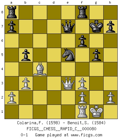 Last move : 0-1 2010 February 11 8:31:1 [Event "FICGS__CHESS__RAPID_C__000080"] [Site "FICGS"] [Date "2009.12.19"] [Round "1"] [White "Colarina,Floram"] [Black "Benoit,Sebastien"] [Result "0-1"] [WhiteElo "1598"] [BlackElo "1584"] 1.d4 Nf6 2.c4 c5 3.e3 g6 4.Nc3 Bg7 5.Nf3 O-O 6.Bd3 cxd4 7.exd4 d5 8.O-O Nc6 9.b3 dxc4 10.Bxc4 Bg4 11.d5 Nxd5 12.Nxd5 Bxa1 13.Bh6 Bg7 14.Bxg7 Kxg7 15.Qa1+ f6 16.Nf4 Qd6 17.Qc1 g5 18.Nd5 Bxf3 19.gxf3 Ne5 20.Qe3 b5 21.Nxe7 Qxe7 0-1 This chess game has been lost on time (started : 2009.12.19 12:37:56) Benoni defense Kingside Castling by player Black (move 5) Kingside Castling by player White (move 8) Player Black won this chess game. Follow this game move after move (download)Up to this point White has been following well-known analysis. But now he makes a fatal error: he begins to use his own head. (Siegbert Tarrasch) Wenn Du nicht kämpfst, um anderen etwas zu beweisen, sondern nur für Dich selbst, dann bist du fast unbesiegbar. (Garry Kasparov) Si un gobernante no entiende al Ajedrez, ¿como puede governar él un reinado?. (El Rey Khusros II) Les Cavaliers se révèlent fort utiles dans les positions fermées. D'habitude, les Fous sont un peu plus forts que les Cavaliers dans les positions ouvertes. Qu'on le veuille ou non, il restera toujours des exceptions ! Luck is when opportunity knocks and you answer. (Anonymous)