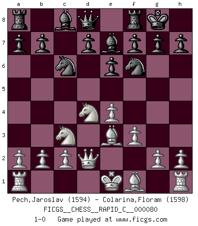 Last move : 1-0 2010 March 24 9:27:5 [Event "FICGS__CHESS__RAPID_C__000080"] [Site "FICGS"] [Date "2009.12.19"] [Round "1"] [White "Pech,Jaroslav"] [Black "Colarina,Floram"] [Result "1-0"] [WhiteElo "1594"] [BlackElo "1598"] 1.e4 c5 2.Nf3 Nc6 3.d4 cxd4 4.Nxd4 e6 5.Nc3 Be7 6.Be3 Nf6 7.f3 O-O 8.Qd2 1-0 This chess game has been lost on time (started : 2009.12.19 12:37:56) Sicilian defense Kingside Castling by player Black (move 7) Player White won this chess game. Follow this game move after move (download)Why must I lose to this idiot ? (Aron Nimzovich) Man wirke der falschen Auffassung entgegen, als ob jeder Zug Unmittelbares zu leisten habe; auch Werte- und Ruhezüge haben ihre Existenzberechtigung. (Aaron Nimzowitsch) La vida es como un juego de Ajedrez, cambiando con cada movimiento. (Proverbio Chino) Un footballeur joue avec ses pieds, parfois avec sa tête. Un joueur d'échecs ne joue qu'avec sa tête. Et quand il ne joue plus, il meurt. (Jacob Murray) The best weapon against an enemy is another enemy. (Friedrich Nietzsche)