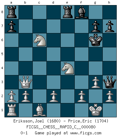 Last move : 0-1 2010 March 4 9:37:13 [Event "FICGS__CHESS__RAPID_C__000080"] [Site "FICGS"] [Date "2009.12.19"] [Round "1"] [White "Eriksson,Joel"] [Black "Price,Eric"] [Result "0-1"] [WhiteElo "1680"] [BlackElo "1704"] 1.e4 e5 2.Nf3 Nc6 3.Bc4 Nf6 4.Ng5 d5 5.exd5 Na5 6.Bb5+ c6 7.dxc6 bxc6 8.Bd3 Nd5 9.Nf3 Bd6 10.O-O Nf4 11.Re1 Nxd3 12.cxd3 O-O 13.Nxe5 Re8 14.d4 Be6 15.Nc3 Nc4 16.Nxc6 Qh4 17.g3 Qh3 18.Re4 Be7 19.d5 Nd6 20.dxe6 Nxe4 21.exf7+ Kxf7 22.Qb3+ Kg6 23.Nxe4 Bf8 0-1 This chess game has been lost on time (started : 2009.12.19 12:37:56) Two knights defense Kingside Castling by player White (move 10) Kingside Castling by player Black (move 12) Player Black won this chess game. Follow this game move after move (download)No Chess Grandmaster is normal; they only differ in the extent of their madness. (Viktor Korchnoi) Kostenjuk hat keinen Sexappeal. (Loek van Wely) Hasta este punto, las blancas han seguido un análisis bien conocido. Pero ahora el hace un error fatal: empieza a usar su propia cabeza. (Siegbert Tarrasch) Je fais ceci parce que dans cinquante coups j'obtiendrai cela; je m'appelle Mikhail Moisevitch Botvinnik. (Botvinnik) A mistake is only a mistake if you let it happen twice. Otherwise it is a learning experience. (Daniel Parmet)