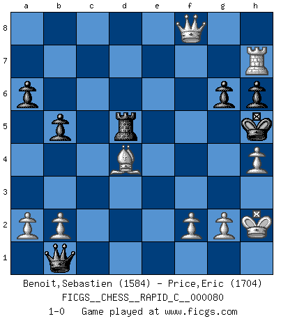 Last move : 1-0 2010 January 30 14:38:47 [Event "FICGS__CHESS__RAPID_C__000080"] [Site "FICGS"] [Date "2009.12.19"] [Round "1"] [White "Benoit,Sebastien"] [Black "Price,Eric"] [Result "1-0"] [WhiteElo "1584"] [BlackElo "1704"] 1.e4 e5 2.Nf3 Nc6 3.Bb5 a6 4.Ba4 Nf6 5.O-O Nxe4 6.d4 b5 7.Bb3 d5 8.dxe5 Be6 9.Nbd2 Nc5 10.c3 d4 11.Bxe6 Nxe6 12.cxd4 Ncxd4 13.Ne4 Qd5 14.Nxd4 Nxd4 15.Nc3 Qd7 16.Be3 Bc5 17.Qh5 Qe6 18.Rad1 Rd8 19.Rd3 g6 20.Qd1 Qb6 21.Ne4 O-O 22.Nxc5 Qxc5 23.Rxd4 Rxd4 24.Qxd4 Qe7 25.Rd1 Qe6 26.Qd5 Qf5 27.Rc1 Re8 28.Rxc7 Rxe5 29.Qd8+ Kg7 30.h4 Rd5 31.Bd4+ Kh6 32.Qf8+ Kh5 33.Rxf7 Qb1+ 34.Kh2 h6 35.Rh7 1-0 Ruy Lopez : Open, 7.Bb3 Kingside Castling by player White (move 5) Kingside Castling by player Black (move 21) Player White won this chess game. Follow this game move after move (download)If I win a tournament, I win it by myself. I do the playing. Nobody helps me. (Bobby Fischer) Schach ist mein Leben, meine Leidenschaft, was ich gelernt habe und seit meinem 14. Lebensjahr profimässig praktiziere. Darauf zu verzichten, würde mir sehr schwer fallen. (Viktor Kortschnoi) El Ajedrez es una hermosa aventura. (Bent Larsen) En blitz, le Cavalier l'emporte sur le Fou. (Vlastimil Hort) A good teacher is like a candle - it consumes itself to light the way for others. (Author unknown)