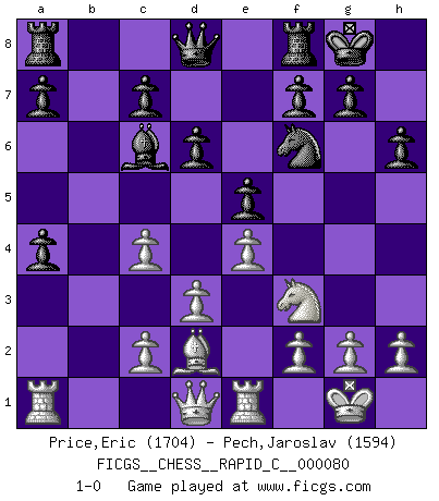 Last move : 1-0 2010 February 24 21:20:0 [Event "FICGS__CHESS__RAPID_C__000080"] [Site "FICGS"] [Date "2009.12.19"] [Round "1"] [White "Price,Eric"] [Black "Pech,Jaroslav"] [Result "1-0"] [WhiteElo "1704"] [BlackElo "1594"] 1.e4 Nf6 2.Nc3 e5 3.Nf3 Nc6 4.Bb5 Bb4 5.d3 d6 6.O-O O-O 7.Bg5 Bxc3 8.bxc3 h6 9.Bd2 Bd7 10.Bxc6 Bxc6 11.Re1 b5 12.a4 bxa4 13.c4 1-0 This chess game has been lost on time (started : 2009.12.19 12:37:56) Alekhine's defense Kingside Castling by player White (move 6) Kingside Castling by player Black (move 6) Player White won this chess game. Follow this game move after move (download)Combinations have always been the most intriguing aspect of Chess. The masters look for them, the public applauds them, the critics praise them. It is because combinations are possible that Chess is more than a lifeless mathematical exercise. They are the poetry of the game; they are to Chess what melody is to music. They represent the triumph of mind over matter. (Reuben Fine) Was ist der Unterschied zwischen einem Strassenarbeiter und einem Schachspieler? --Der Schachspieler bewegt sich ab und zu. (Anonymous) Todo se encuentra en un estado de flujo y esto incluye al mundo del Ajedrez. (Mikhail Botvinnik) Soyez une menace à chaque fois que vous vous asseyez pour jouer. (Ken Smith) Chess is as much a mystery as women. (Purdy)
