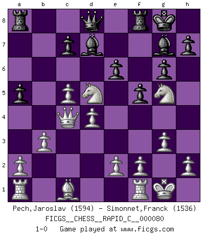 Last move : 1-0 2010 February 19 8:32:5 [Event "FICGS__CHESS__RAPID_C__000080"] [Site "FICGS"] [Date "2009.12.19"] [Round "1"] [White "Pech,Jaroslav"] [Black "Simonnet,Franck"] [Result "1-0"] [WhiteElo "1594"] [BlackElo "1536"] 1.d4 f5 2.Nf3 Nf6 3.g3 g6 4.Bg2 Bg7 5.O-O O-O 6.c4 d6 7.Nc3 Nbd7 8.Ng5 Nb6 9.c5 Nc4 10.Qa4 d5 11.b3 Bd7 12.Qb4 a5 13.Qxb7 Rb8 14.Qa6 Ra8 15.Bxd5+ Nxd5 16.Qxc4 e6 17.Nxd5 1-0 Dutch Kingside Castling by player White (move 5) Kingside Castling by player Black (move 5) Player White won this chess game. Follow this game move after move (download)Chess mastery essentially consists of analyzing Chess positions accurately. (Mikhail Botvinnik) Obwohl ich alt bin, darf mir niemand den Finger in den Mund stecken, sonst beisse ich. (Wilhelm Steinitz) Nunca antes ha habido un jugador de Ajedrez con tal conocimiento a fondo de las complejidades del juego y una inmensa voluntad absolutamente indomable de ganar. Yo pienso que Fischer es el jugador mas grande que jamás haya existido. (Lisa Lane) Avec des compensations pour le matériel en plus... (Anonyme) Two beer, or not two beer. (Unknown)