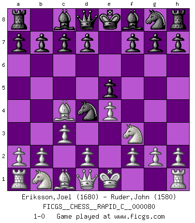 Last move : 1-0 2010 January 22 8:22:16 [Event "FICGS__CHESS__RAPID_C__000080"] [Site "FICGS"] [Date "2009.12.19"] [Round "1"] [White "Eriksson,Joel"] [Black "Ruder,John"] [Result "1-0"] [WhiteElo "1680"] [BlackElo "1580"] 1.e4 e5 2.Nf3 Nc6 3.Bc4 Nd4 4.c3 1-0 This chess game has been lost on time (started : 2009.12.19 12:37:56) King's pawn game Player White won this chess game. Follow this game move after move (download)Fischer prefers to enter Chess history alone. (Miguel Najdorf) Ich rechne überhaupt nicht voraus. Ich gewinne auch so. (Robert James Fischer) Un entendimiento a fondo de las continuaciones típicas del mate, hace de las combinaciones de sacrificio mas complicadas conducirlas a ellas no solo sin dificultad, sino casi de una manera natural. (Siegbert Tarrasch) Aidez vos pièces, elles vous aideront. (Paul Morphy) We cannot be sure of having something to live for unless we are willing to die for it. (Ernesto Che Guevara)