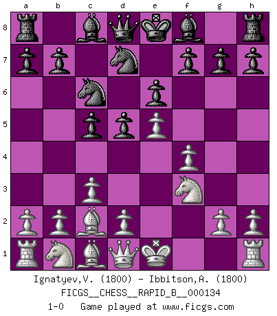 Last move : 1-0 2010 January 25 20:24:18 [Event "FICGS__CHESS__RAPID_B__000134"] [Site "FICGS"] [Date "2009.12.19"] [Round "1"] [White "Ignatyev,Vladimir"] [Black "Ibbitson,Anthon"] [Result "1-0"] [WhiteElo "1800"] [BlackElo "1800"] 1.e4 c5 2.f4 e6 3.c3 Nf6 4.Bd3 d5 5.e5 Nfd7 6.Nf3 Nc6 7.Bc2 1-0 This chess game has been lost on time (started : 2009.12.19 17:27:56) Sicilian : Grand Prix attack Player White won this chess game. Follow this game move after move (download)Only the player with the initiative has the right to attack. (Wilhelm Steinitz) Verschiedene, sehr schätzbare und im Laufe des Lebens nützliche Eigenschaften des Geistes können durch das Schachspiel erworben und gekräftigt werden, so dass sie zu Gewohnheiten werden, die uns nie im Stich lassen. (Benjamin Franklin) Cuando tu no sabes absolutamente que mas hacer, es tiempo de entrar en pánico. (John van der Wiel) Les Echecs ont trois composantes : le temps, l'espace et le matériel en dernier. (Mikhail Tal) I feel so... helpless. (C-3PO in Star Wars ep.3)