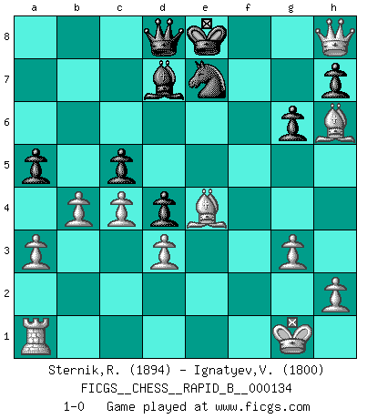Last move : 1-0 2009 December 31 7:17:10 [Event "FICGS__CHESS__RAPID_B__000134"] [Site "FICGS"] [Date "2009.12.19"] [Round "1"] [White "Sternik,Ryszard"] [Black "Ignatyev,Vladimir"] [Result "1-0"] [WhiteElo "1894"] [BlackElo "1800"] 1.Nf3 d5 2.c4 d4 3.g3 f6 4.Bg2 c5 5.d3 e5 6.O-O Bd6 7.e3 Nc6 8.exd4 cxd4 9.a3 a5 10.Nbd2 Nge7 11.Qa4 Bd7 12.Ne4 Bc7 13.Nc5 Bc8 14.b4 b6 15.Nxe5 bxc5 16.Bxc6+ Kf8 17.Bxa8 fxe5 18.Be4 Kf7 19.f4 Bh3 20.Rf2 Bd7 21.fxe5 Ke8 22.Qd1 Bxe5 23.Qh5+ g6 24.Qxe5 Rf8 25.Rxf8+ Kxf8 26.Bh6+ Ke8 27.Qh8+ 1-0 Reti : Advance variation Kingside Castling by player White (move 6) Player White won this chess game. Follow this game move after move (download)Winning isn't everything... but losing is nothing. (Mednis) Das ganze Leben mit einer Ehefrau ist wie ein Endspiel mit ungleichfarbigen Läufern. (Viktor Kortschnoi) El Ajedrez por encima de todo... ¡es una pelea!. (Emanuel Lasker) Psychologiquement, tu dois avoir confiance en toi même, mais cette confiance doit être basée sur des faits. (Robert Fischer) I don't know, I don't care, and it doesn't make any difference. (Albert Einstein)