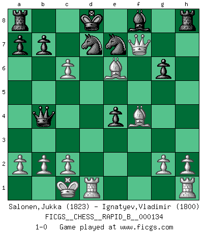 Last move : 1-0 2009 December 30 8:30:20 [Event "FICGS__CHESS__RAPID_B__000134"] [Site "FICGS"] [Date "2009.12.19"] [Round "1"] [White "Salonen,Jukka"] [Black "Ignatyev,Vladimir"] [Result "1-0"] [WhiteElo "1823"] [BlackElo "1800"] 1.e4 e5 2.Nf3 d6 3.d4 f5 4.exf5 e4 5.Ng5 Bxf5 6.Nc3 d5 7.f3 exf3 8.Qxf3 Ne7 9.Bd3 h6 10.Bxf5 hxg5 11.Be6 Qd6 12.Qf7+ Kd8 13.Bxg5 c6 14.O-O-O Nd7 15.Bf4 Qb4 16.Ne4 dxe4 17.d5 g6 18.dxc6 1-0 Philidor : Philidor counter-gambit Queenside Castling by player White (move 14) Player White won this chess game. Follow this game move after move (download)Chess is in its essence a game, in its form an art, and in its execution a science. (Baron Tassilo) Gewinnen beim Schach fördert das Selbstvertrauen. Beim Sex spüre ich sowas nicht... (Garry Kasparov) La caracteristica mas importante en la posición del Ajedrez es la actividad de las piezas. Esto es absolutamente fundamental en todas las fases del juego: Apertura, Juego Medio y especialmente Finales. La limitación primordial en la actividad de una pieza, es la estructuración de los Peones. (Michael Stean) Je fais ceci parce que dans cinquante coups j'obtiendrai cela; je m'appelle Mikhail Moisevitch Botvinnik. (Botvinnik) If you know the enemy and know yourself you need not fear the results of a hundred battles. (Sun Tzu)