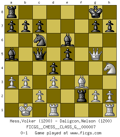 Last move : 0-1 2006 November 21 7:9:18 [Event "FICGS__CHESS__CLASS_G__000007"] [Site "FICGS"] [Date "2006.10.08"] [Round "1"] [White "Hess,Volker"] [Black "Daligcon,Nelson"] [Result "0-1"] [WhiteElo "1200"] [BlackElo "1200"] 1.e4 e5 2.Nf3 f5 3.d3 Nc6 4.Nc3 Nf6 5.Bg5 Bb4 6.Qd2 O-O 7.O-O-O d6 8.Bxf6 Qxf6 9.exf5 Bxf5 10.a3 Ba5 11.Be2 d5 12.Kb1 d4 13.Nd5 Qe6 14.Qg5 Qxd5 15.Nh4 Be6 16.b3 Rxf2 17.Bf3 Qc5 0-1 Latvian counter-gambit Kingside Castling by player Black (move 6) Queenside Castling by player White (move 7) Player Black won this chess game. Follow this game move after move (download)When asked, -How is that you pick better moves than your opponents?, I responded: I'm very glad you asked me that, because, as it happens, there is a very simple answer. I think up my own moves, and I make my opponent think up his. (Alexander Alekhine) Modernes Schach sorgt sich zuviel um Dinge wie Bauernstruktur usw. Vergessen Sie das, Schachmatt beendet das Spiel! (Nigel Short) El Ajedrez es el arte del análisis. (Mikhail Botvinnik) A ce moment-là, je menaçais de comprendre la position ! (Clément L'Heureux) It's not the size of the dog in the fight, it's the size of the fight in the dog. (Mark Twain)