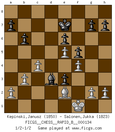 Last move : 1/2-1/2 2010 February 17 16:28:30 [Event "FICGS__CHESS__RAPID_B__000134"] [Site "FICGS"] [Date "2009.12.19"] [Round "1"] [White "Kepinski,Janusz"] [Black "Salonen,Jukka"] [Result "1/2-1/2"] [WhiteElo "1850"] [BlackElo "1823"] 1.Nf3 Nf6 2.b3 c5 3.Bb2 e6 4.e3 Be7 5.Be2 O-O 6.O-O Nc6 7.c4 d5 8.d4 cxd4 9.exd4 b6 10.Nbd2 Bb7 11.Re1 Rc8 12.Rc1 Ne4 13.Nxe4 dxe4 14.Ne5 Nxe5 15.dxe5 Bb4 16.Qxd8 Rfxd8 17.Red1 Bd2 18.Rc2 e3 19.f3 Kf8 20.Bc1 Bxc1 21.R2xc1 Ke7 22.Rxd8 Rxd8 23.Rd1 Rxd1+ 24.Bxd1 f5 25.f4 Be4 26.Kf1 Bd3+ 27.Be2 1/2-1/2 Reti Opening Kingside Castling by player Black (move 5) Kingside Castling by player White (move 6) This chess game ended in a draw. Follow this game move after move (download)I had a toothache during the first game. In the second game I had a headache. In the third game it was an attack of rheumatism. In the fourth game, I wasn't feeling well. And in the fifth game? Well, must one have to win every game ? (Siegbert Tarrasch) Deine Wertungszahl - vorausgesetzt einige Jahre schachliche Anstrengung - entspricht etwa dem zehnfachen Deines IQ plus 1000. (Jonathan Levitt) Hoy en día, si tu no eres un Gran Maestro a los 14 años, es mejor que lo olvides. (Anand Viswanathan) C'est une question de caractère, Beaucoup de gens perdent leur motivation très vite. D'autres, ils sont rares, peuvent la conserver très longtemps. J'aime les échecs, encore aujourd'hui je suis heureux d'analyser des parties. J'aime toujours gagner, je déteste encore perdre. Bien jouer est important pour mon intégrité intellectuelle et morale. Et puis les échecs vivent en ce moment une période historique grâce à Internet. Ils se développent dans les systèmes éducatifs à travers le monde. Ils sortent de leur ghetto, et c'est mon rôle de mener à bien cette révolution. (Gary Kasparov) The human is the only animal species whose members are able to talk themselves into difficulties that would not otherwise exist. (Wendell Johnson)