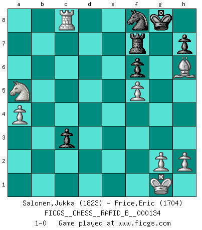 Last move : 1-0 2010 February 4 16:59:14 [Event "FICGS__CHESS__RAPID_B__000134"] [Site "FICGS"] [Date "2009.12.19"] [Round "1"] [White "Salonen,Jukka"] [Black "Price,Eric"] [Result "1-0"] [WhiteElo "1823"] [BlackElo "1704"] 1.e4 e5 2.Nf3 Nc6 3.Bb5 a6 4.Ba4 Nf6 5.O-O Nxe4 6.d4 b5 7.Bb3 d5 8.dxe5 Be6 9.Nbd2 Nc5 10.c3 d4 11.Bxe6 Nxe6 12.cxd4 Ncxd4 13.Nb3 Nxb3 14.Qxb3 Be7 15.Rd1 Qc8 16.a4 b4 17.Be3 a5 18.Rd5 O-O 19.Rad1 c5 20.Qc4 Qa6 21.Qxa6 Rxa6 22.Rd7 Re8 23.Nd2 Bg5 24.Bxg5 Nd4 25.Nc4 f6 26.exf6 gxf6 27.Be3 Ne6 28.f4 Nf8 29.Rd8 Ra8 30.Rxa8 Rxa8 31.f5 Rc8 32.Rd5 Rc7 33.Nxa5 c4 34.Rd8 c3 35.Bh6 Rf7 36.bxc3 bxc3 37.Rc8 1-0 Ruy Lopez : Open, 7.Bb3 Kingside Castling by player White (move 5) Kingside Castling by player Black (move 18) Player White won this chess game. Follow this game move after move (download)Human affairs are like a Chess game: only those who do not take it seriously can be called good players. (Hung Tzu Ch'eng) Die größte Kunst beim Schach besteht darin dem Gegner nicht zu zeigen was er tun kann. (Garry Kasparov) No nos podemos resistir a la fascinación de un sacrificio ya que la pasión por los sacrificios es parte de la naturaleza de un jugador de Ajedrez. (Rudolf Spielman) La tactique est l'élément le plus important du milieu de jeu. (Siegbert Tarrasch) I can't decide which is riskier; taking crazy risks, or taking advice on crazy risks from a crazy risk taker. (Gregory House in House M.D.)