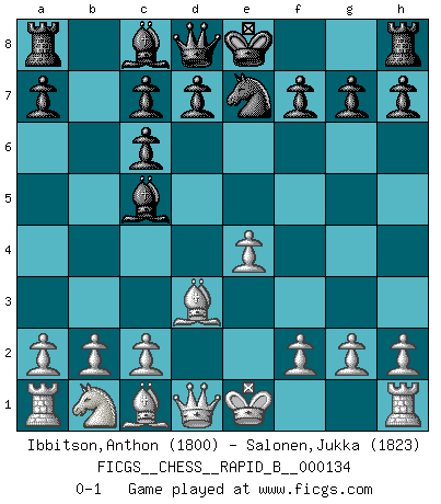 Last move : 0-1 2010 January 26 20:27:45 [Event "FICGS__CHESS__RAPID_B__000134"] [Site "FICGS"] [Date "2009.12.19"] [Round "1"] [White "Ibbitson,Anthon"] [Black "Salonen,Jukka"] [Result "0-1"] [WhiteElo "1800"] [BlackElo "1823"] 1.e4 e5 2.Nf3 Nc6 3.d4 exd4 4.Nxd4 Bc5 5.Nxc6 bxc6 6.Bd3 Ne7 0-1 This chess game has been lost on time (started : 2009.12.19 17:27:56) Scotch game Player Black won this chess game. Follow this game move after move (download)I'm not a materialistic person, in that, I don't suffer the lack or loss of money. The absence of worldly goods I don't look back on. For Chess is a way I can be as materialistic as I want without having to sell my soul. (Jamie Walter Adams) Wenn ich einen Club besuche, sind die Spieler stumm vor Staunen. (José Raúl Capablanca) Nos gusta pensar. (Gary Kasparov) D'abord les bases : Jouez et étudiez, puis étudiez et jouez, ensuite jouez et étudiez, puis étudiez et jouez. Deuxièmement : Donnez toujours le meilleur de vous-même ! (Ken Smith) The problem with troubleshooting is that trouble shoots back. (Anonymous)